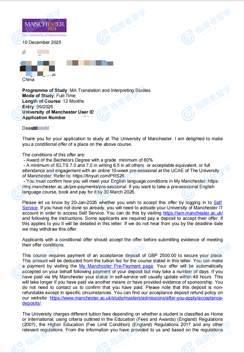 曼彻斯特大学笔译与口译研究文学硕士研究生offer一枚