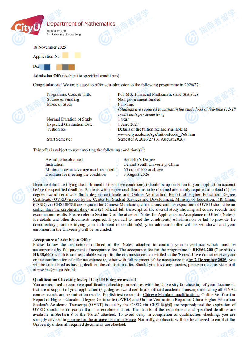 香港城市大学金融数学与统计理学硕士研究生offer一枚