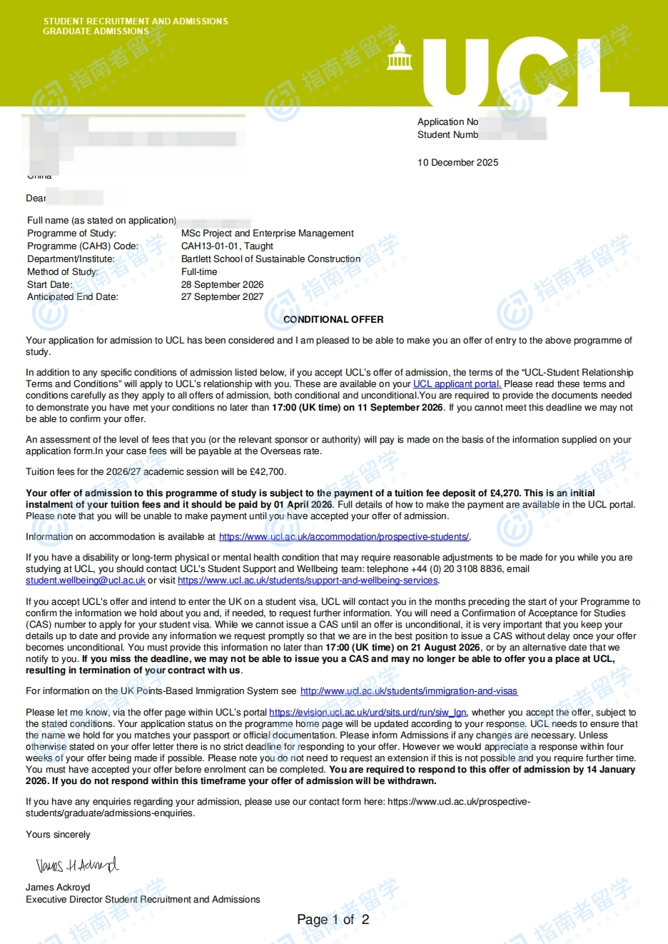 伦敦大学学院项目与企业管理理学硕士研究生offer一枚