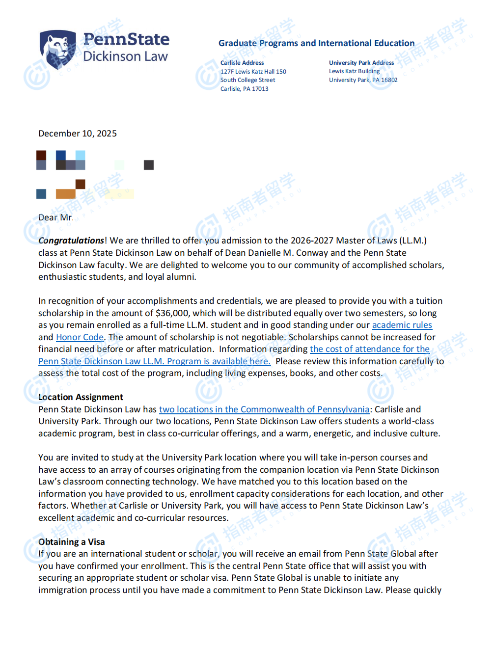 宾夕法尼亚州立大学法学硕士研究生offer一枚