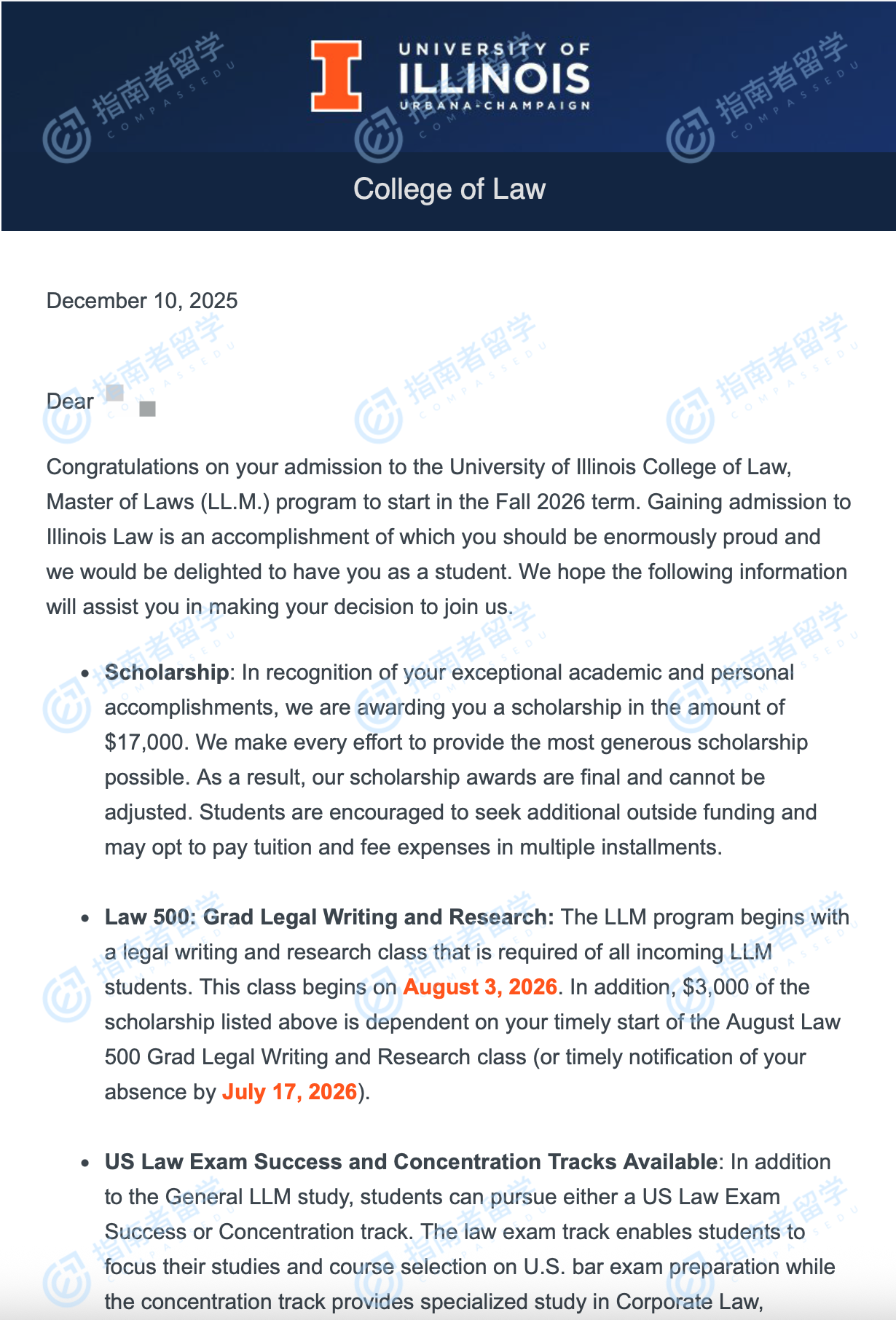 伊利诺伊大学香槟分校法学硕士研究生offer一枚