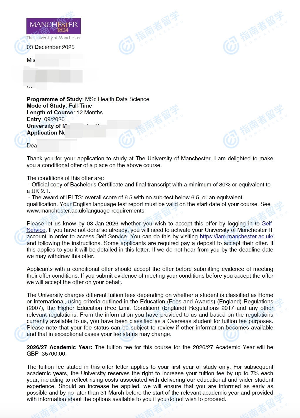曼彻斯特大学健康数据科学理学硕士研究生offer一枚