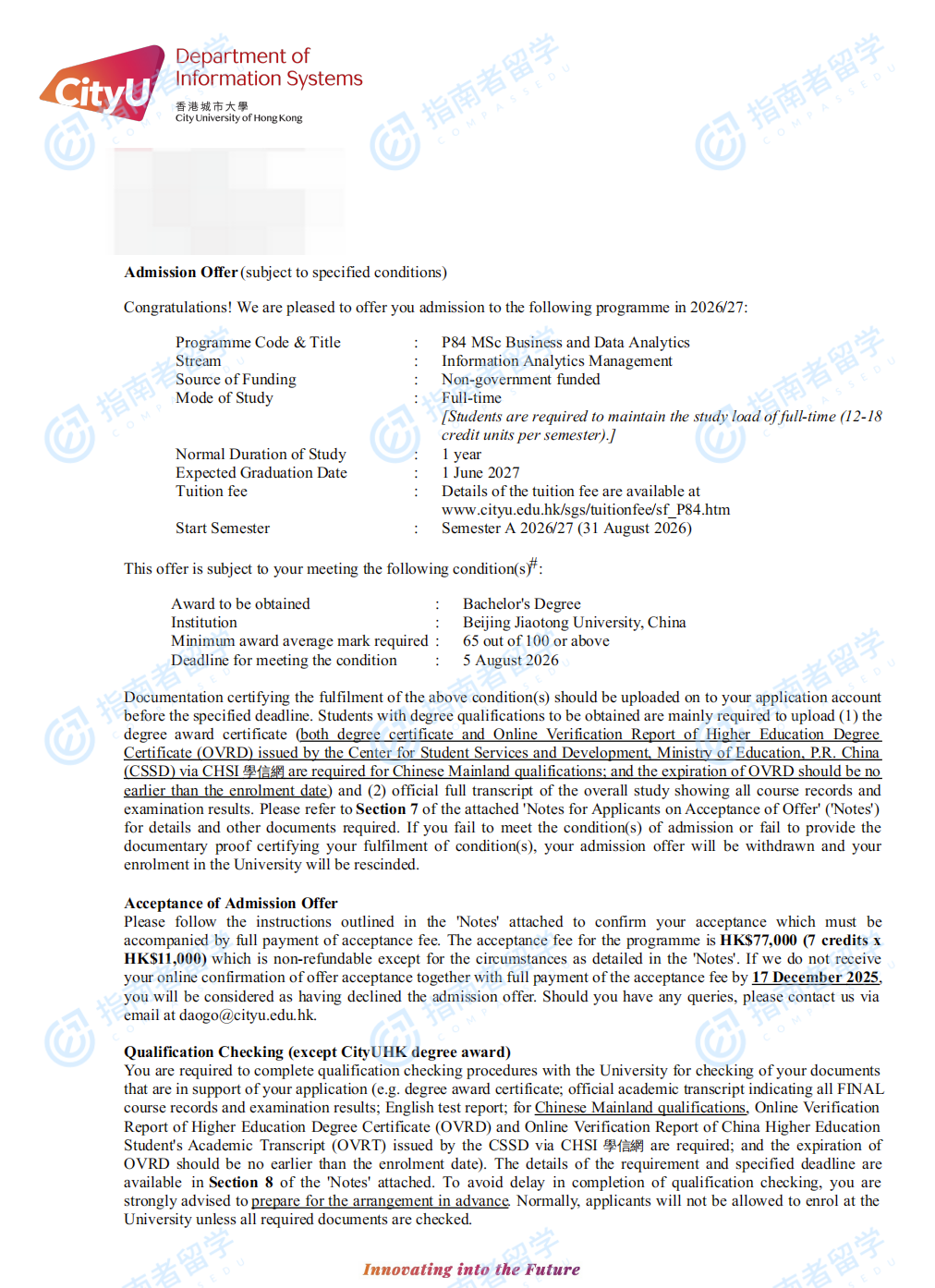 香港城市大学商业及数据分析理学硕士研究生offer一枚