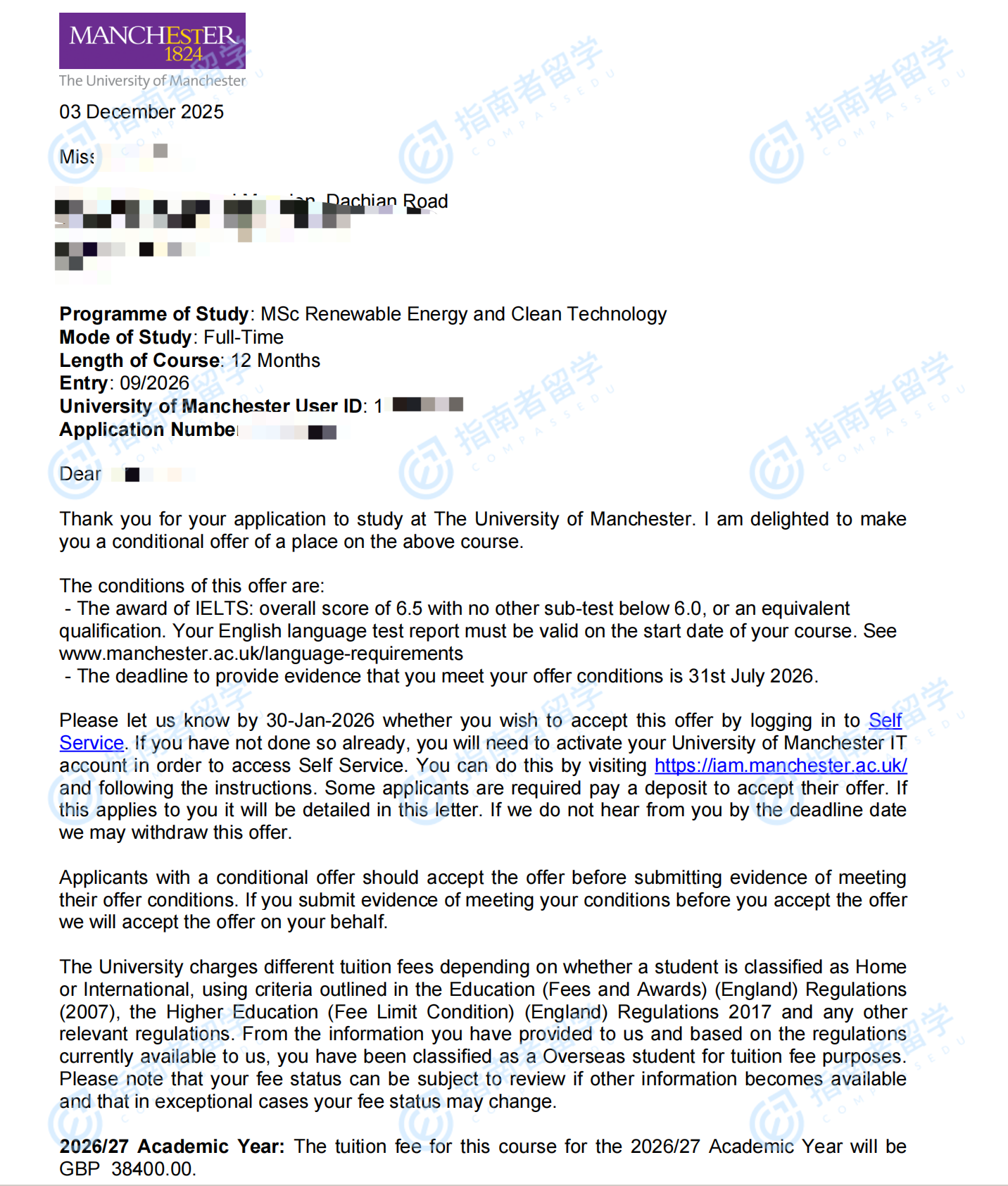 曼彻斯特大学可再生能源与清洁技术理学硕士研究生offer一枚