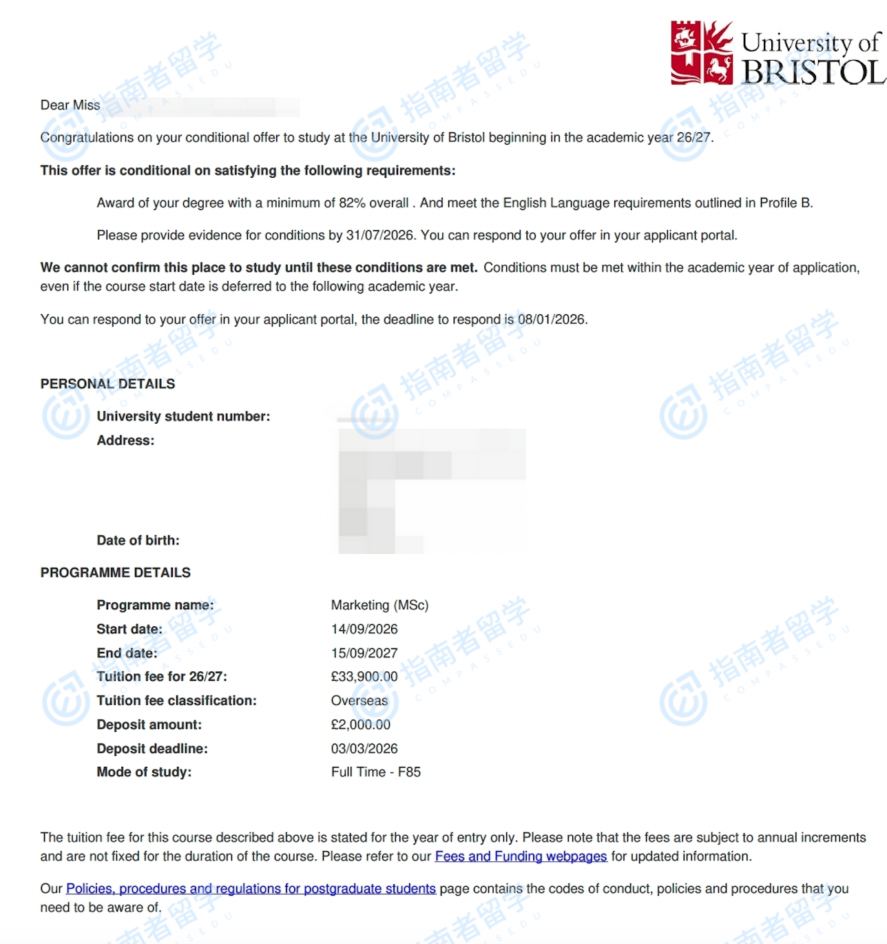 布里斯托大学市场营销理学硕士研究生offer一枚