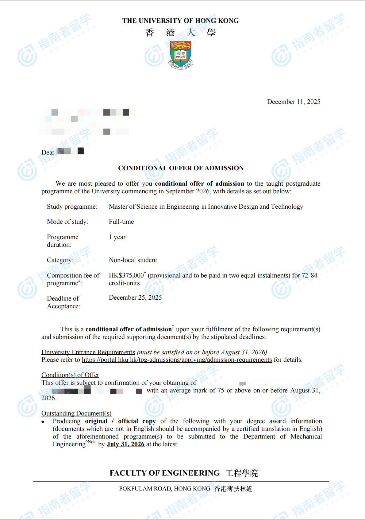 香港大学创新设计与科技(工程)理学硕士研究生offer一枚