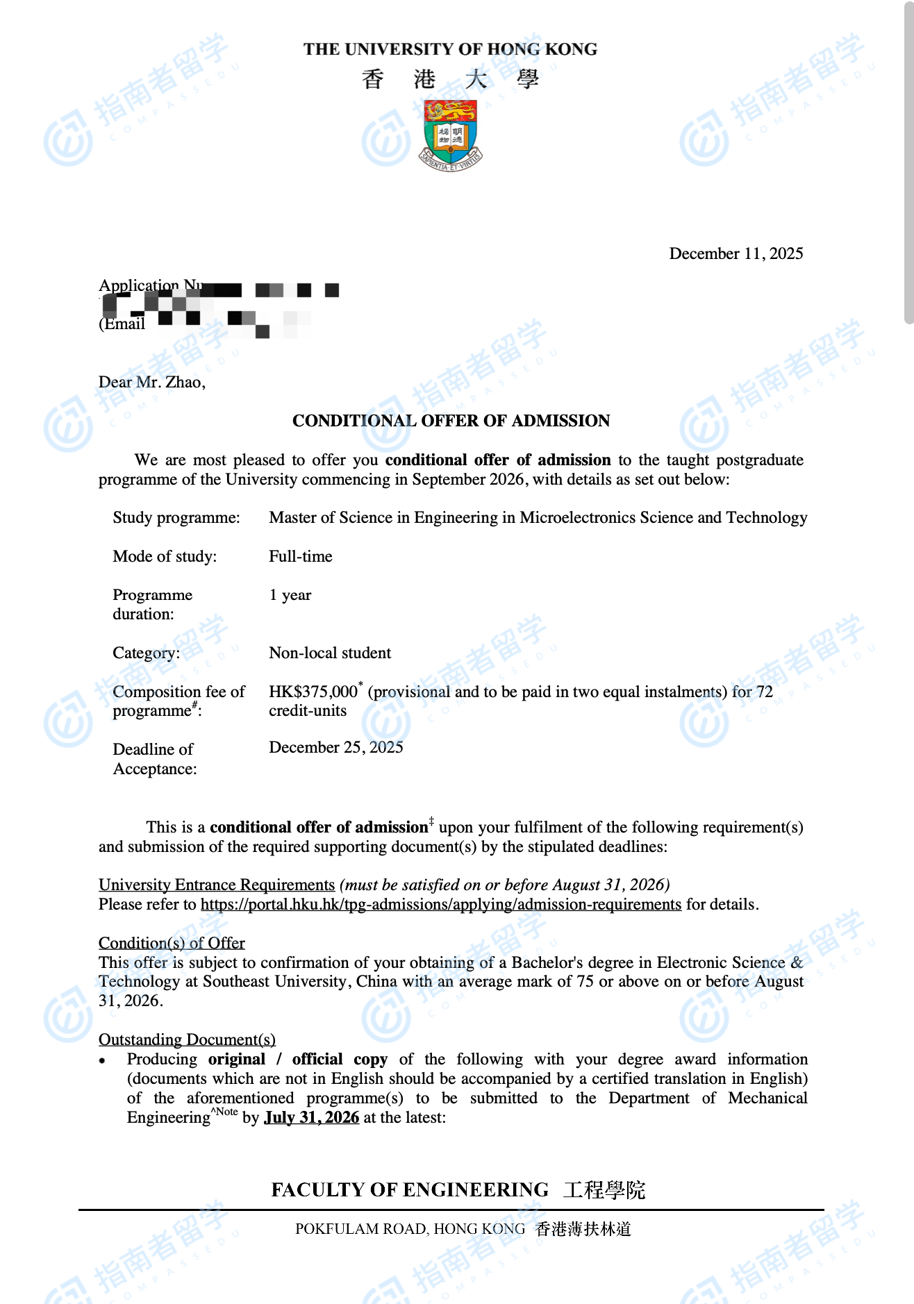 香港大学微电子科学与技术(工程)理学硕士研究生offer一枚