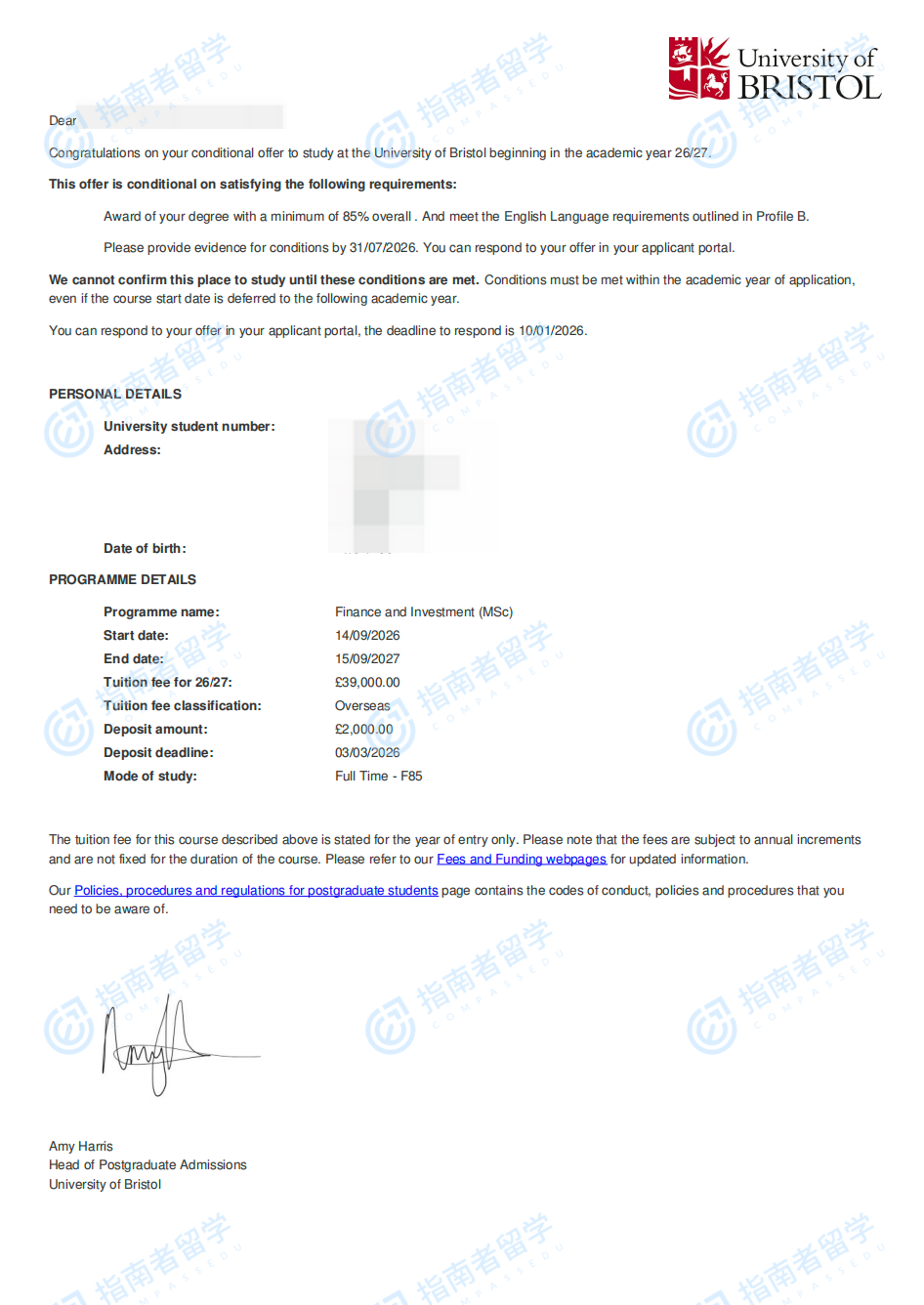 布里斯托大学金融与投资理学硕士研究生offer一枚