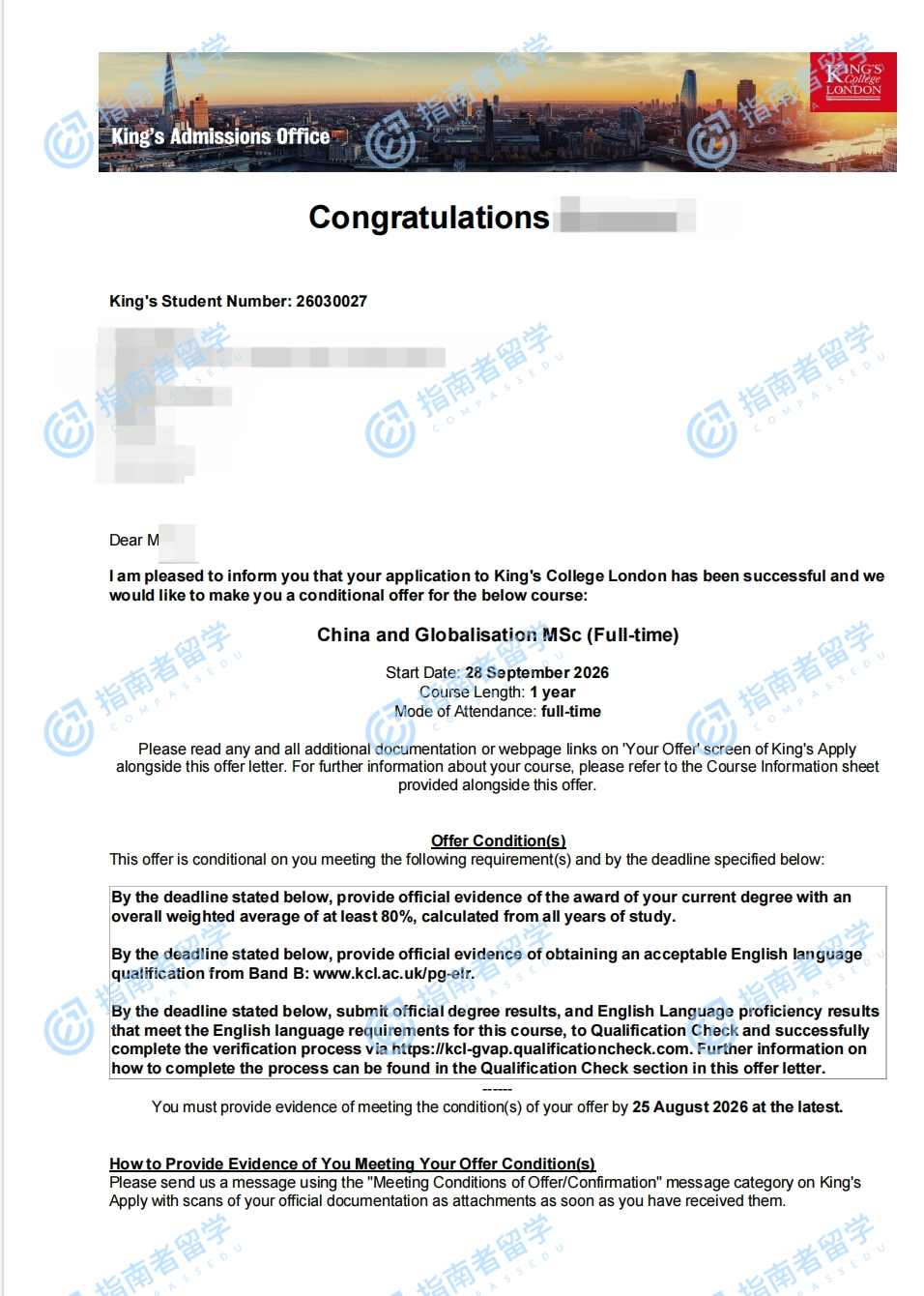 伦敦大学国王学院中国与全球化理学硕士研究生offer一枚