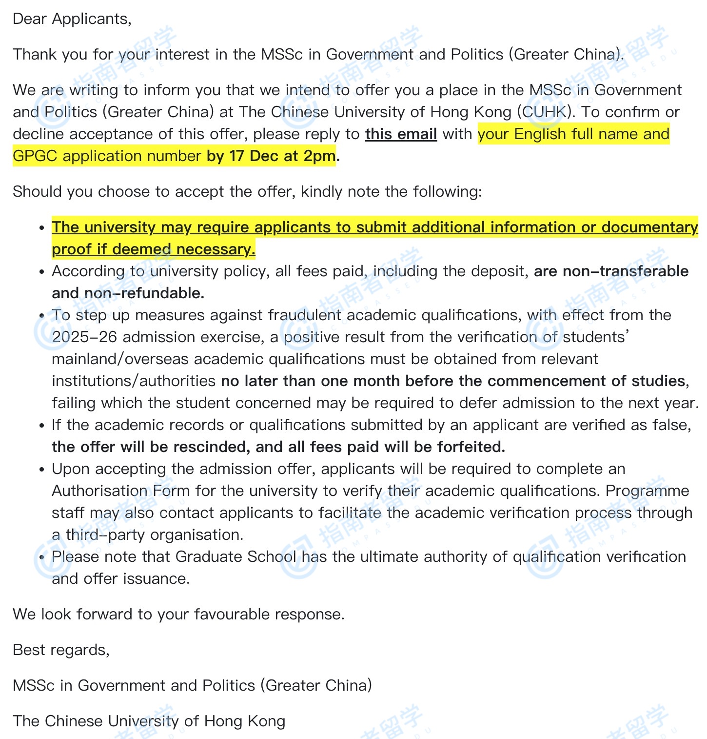 香港中文大学大中华地区的政府与政治社会科学硕士研究生offer一枚