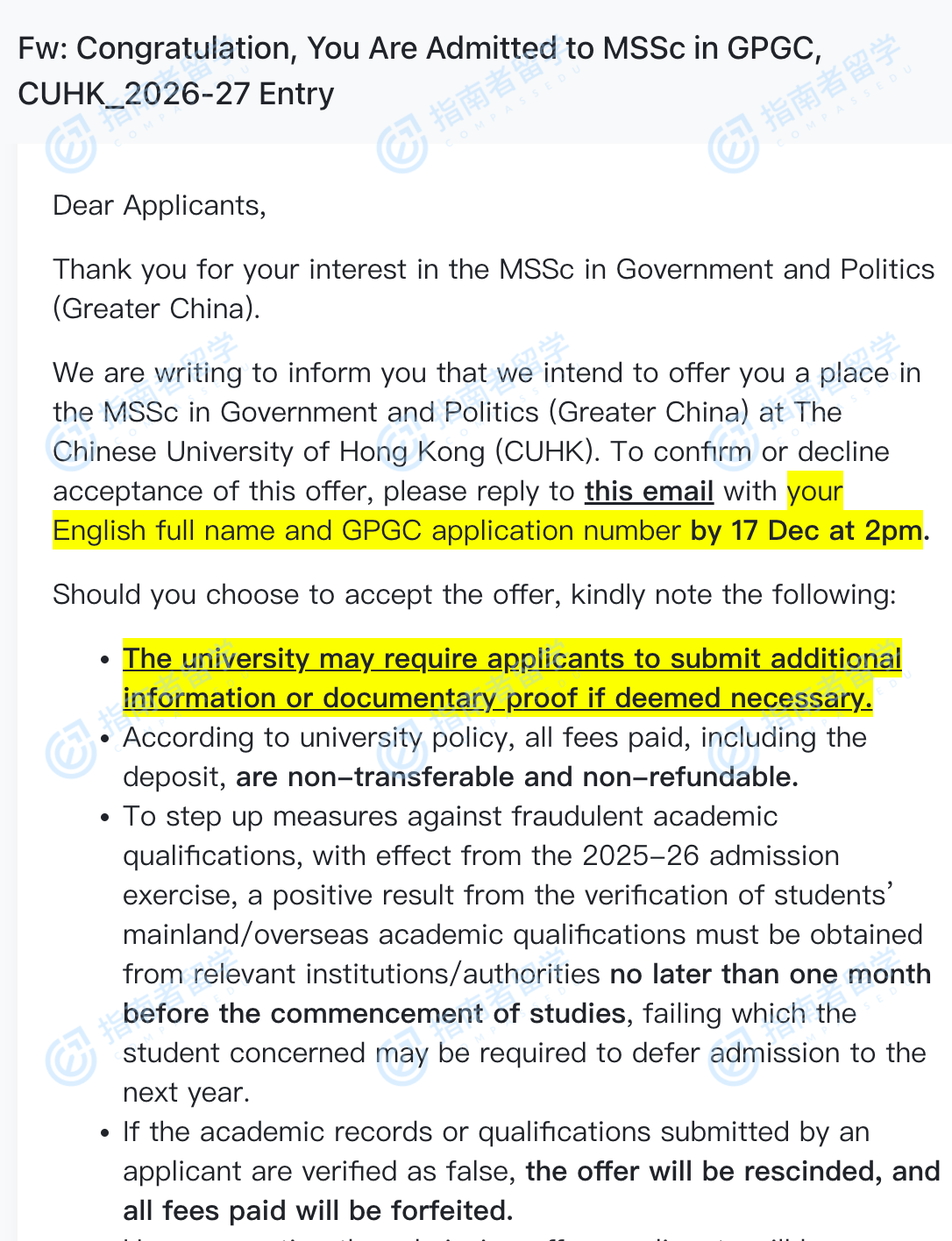 香港中文大学大中华地区的政府与政治社会科学硕士研究生offer一枚