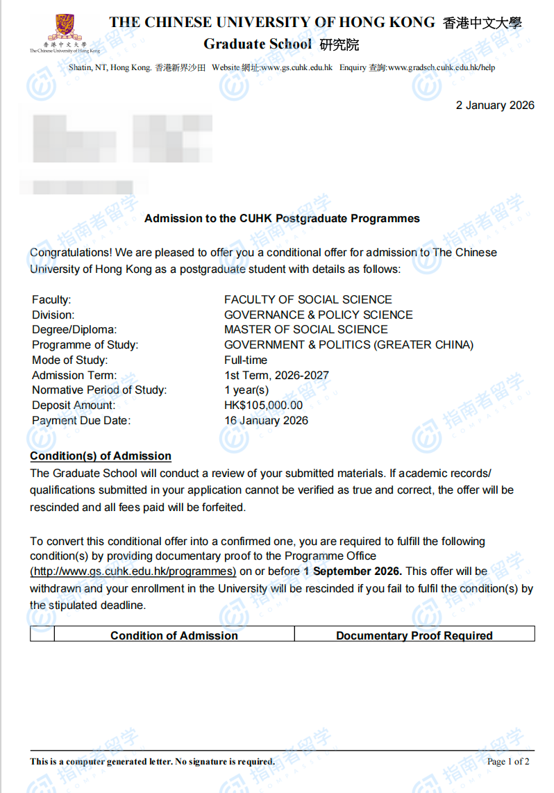 香港中文大学大中华地区的政府与政治社会科学硕士研究生offer一枚