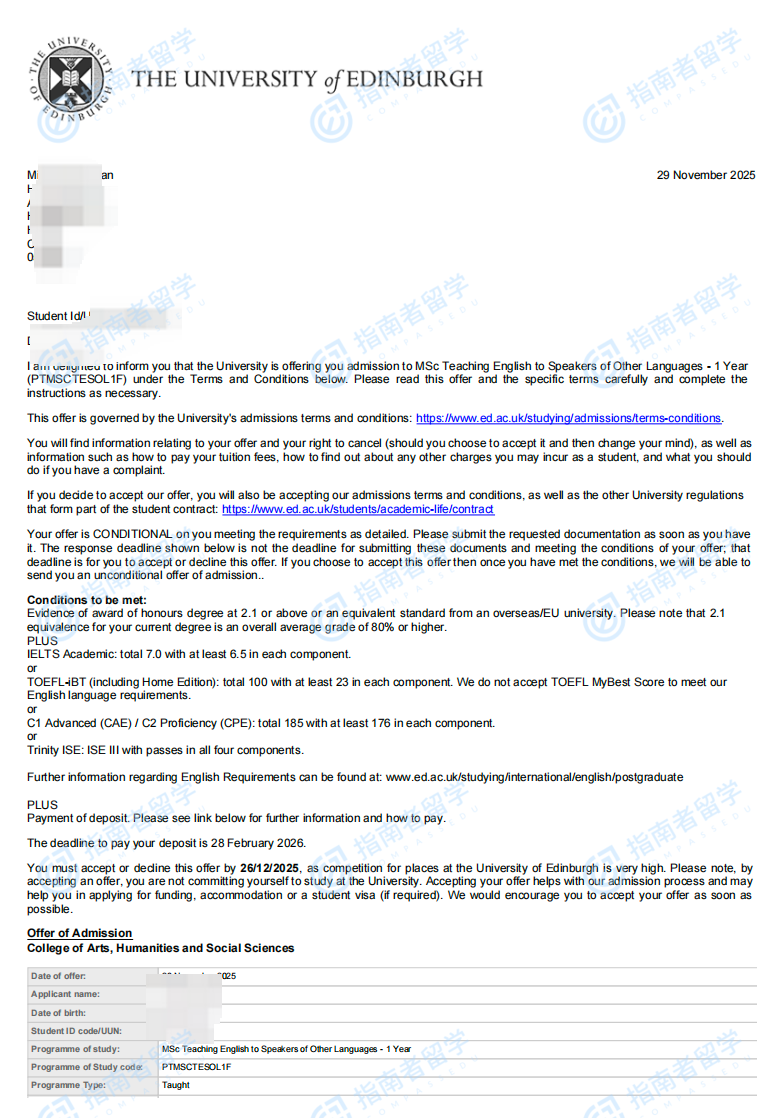 爱丁堡大学对外英语教学理学硕士研究生offer一枚