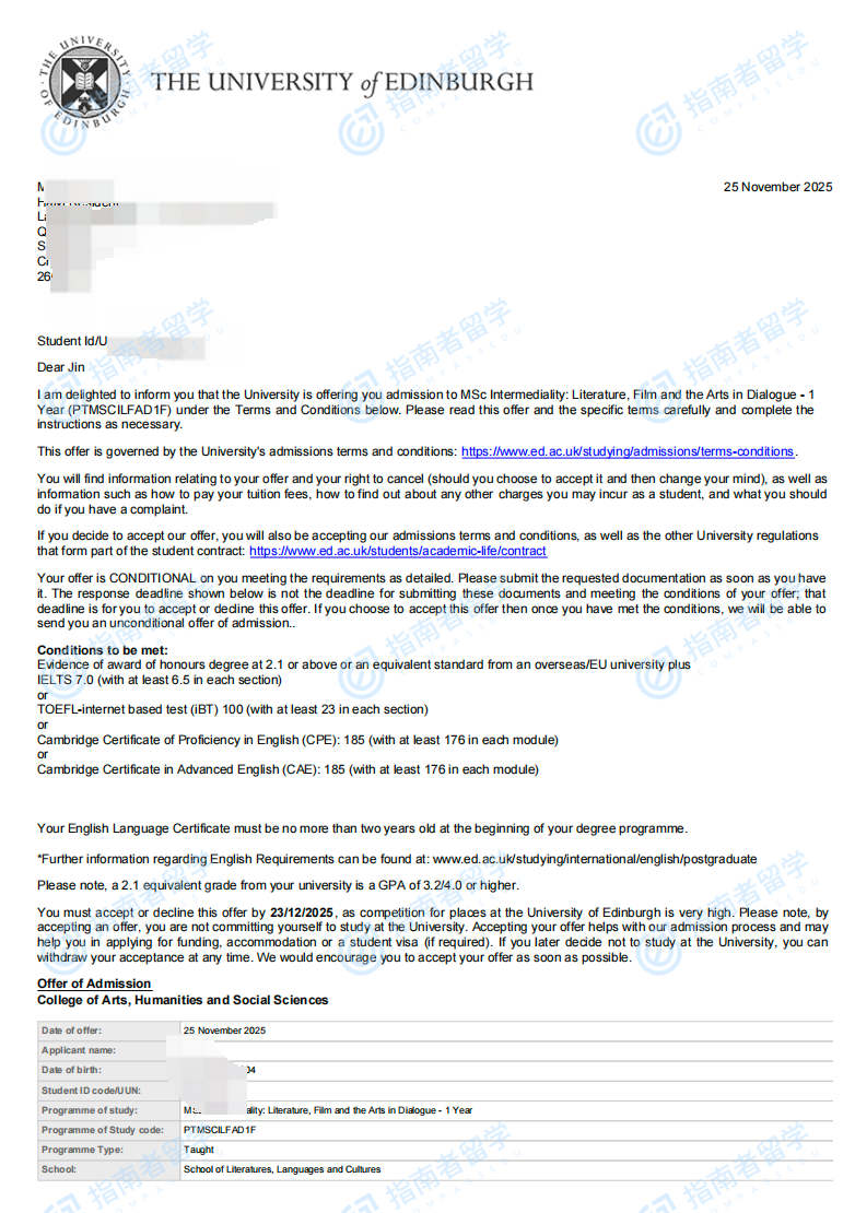 爱丁堡大学媒介间性:文学、电影与对话中的艺术理学硕士研究生offer一枚