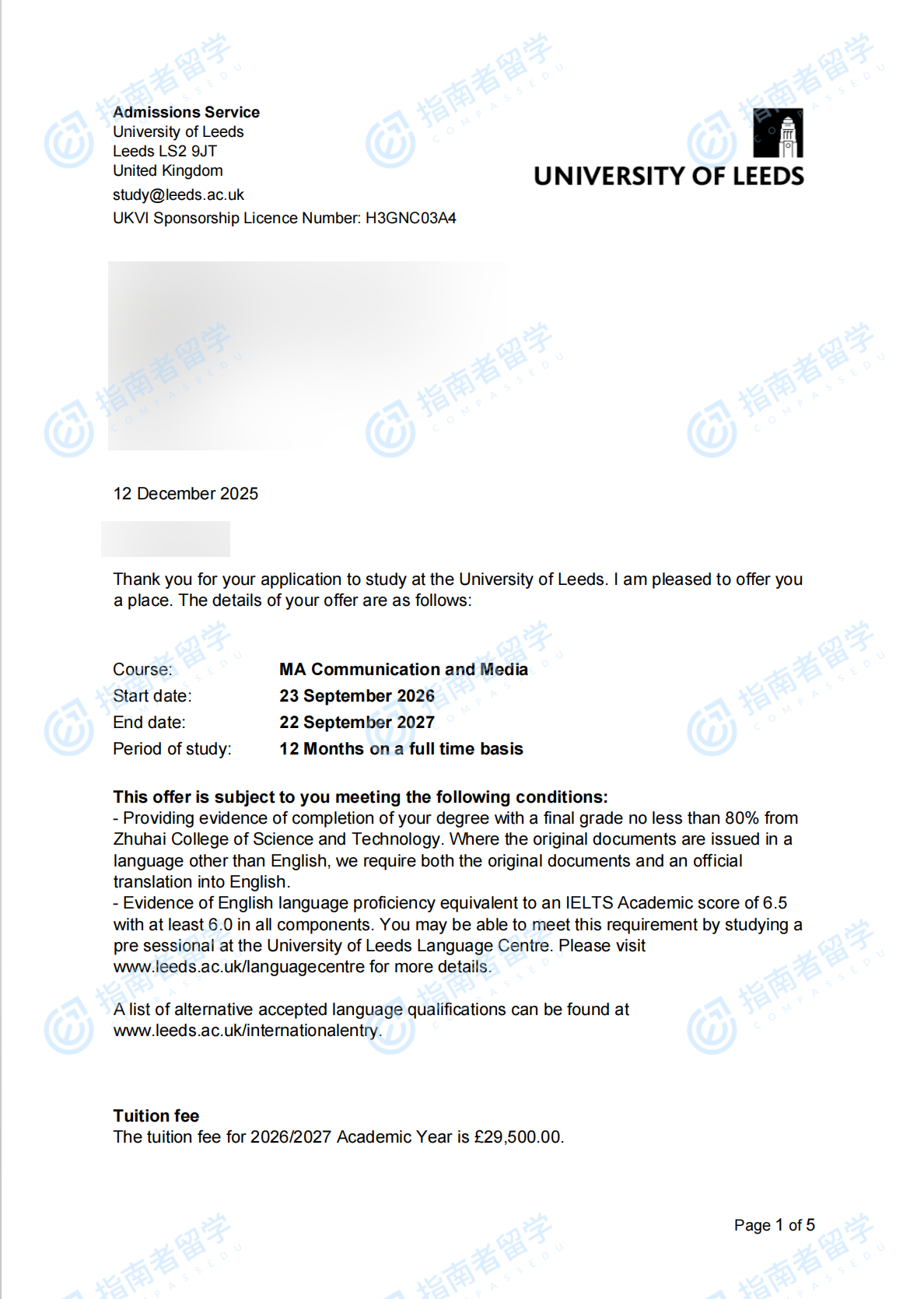 利兹大学传播与媒体文学硕士研究生offer一枚