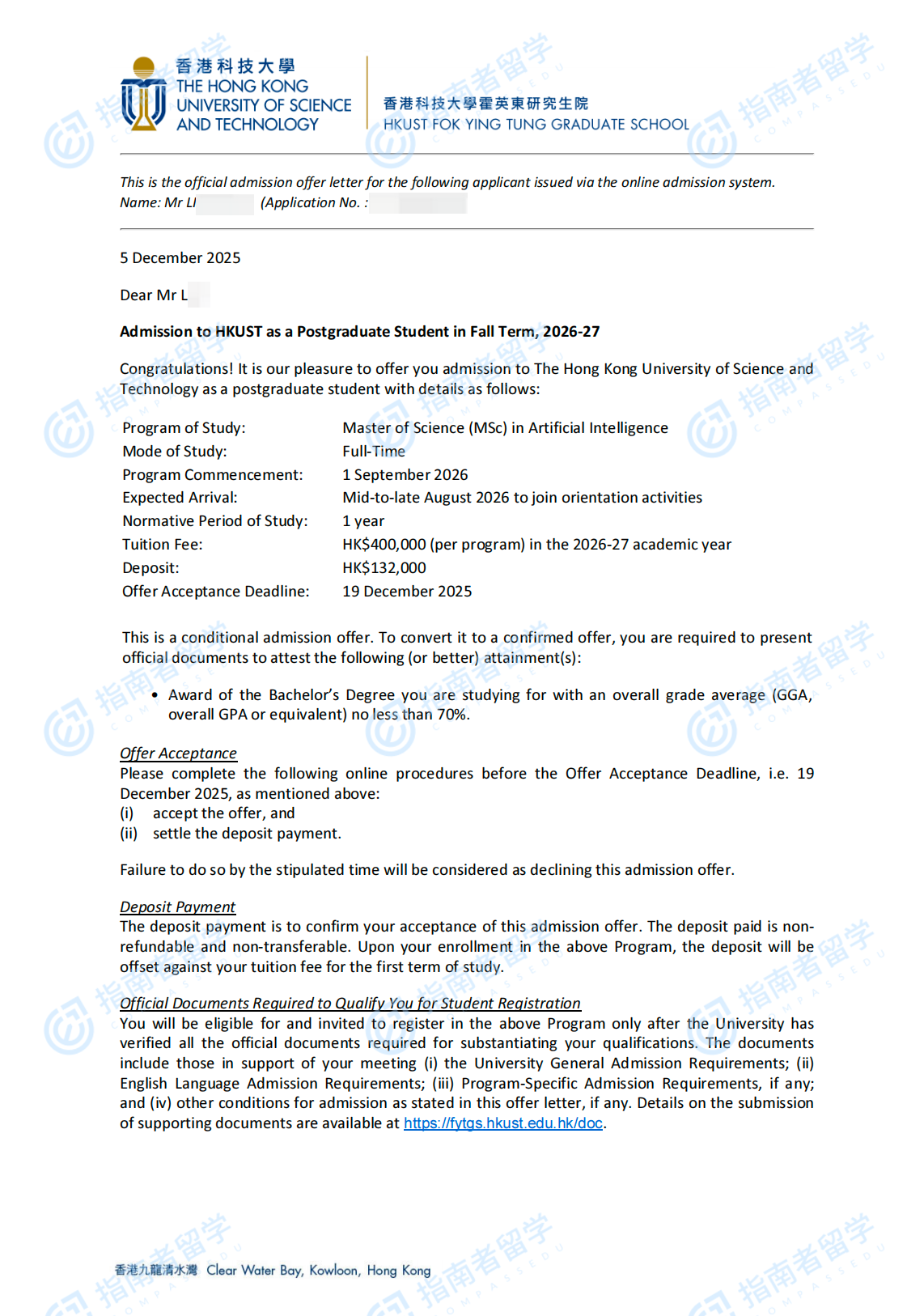 香港科技大学人工智能理学硕士研究生offer一枚
