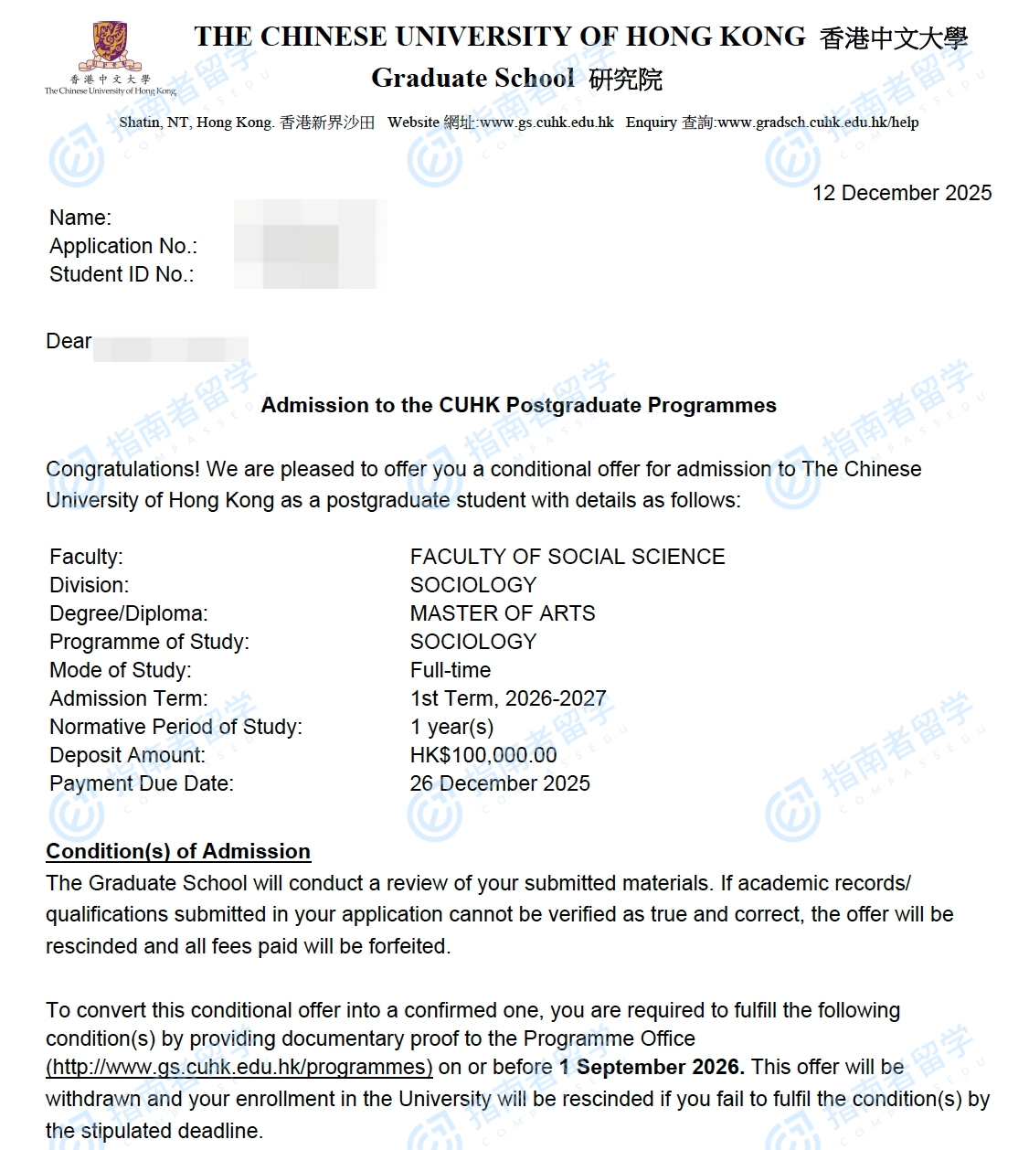 香港中文大学社会学文学硕士研究生offer一枚