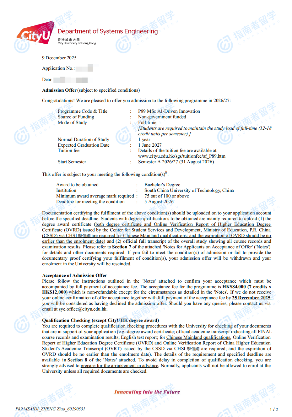 香港城市大学人工智能驱动创新理学硕士研究生offer一枚