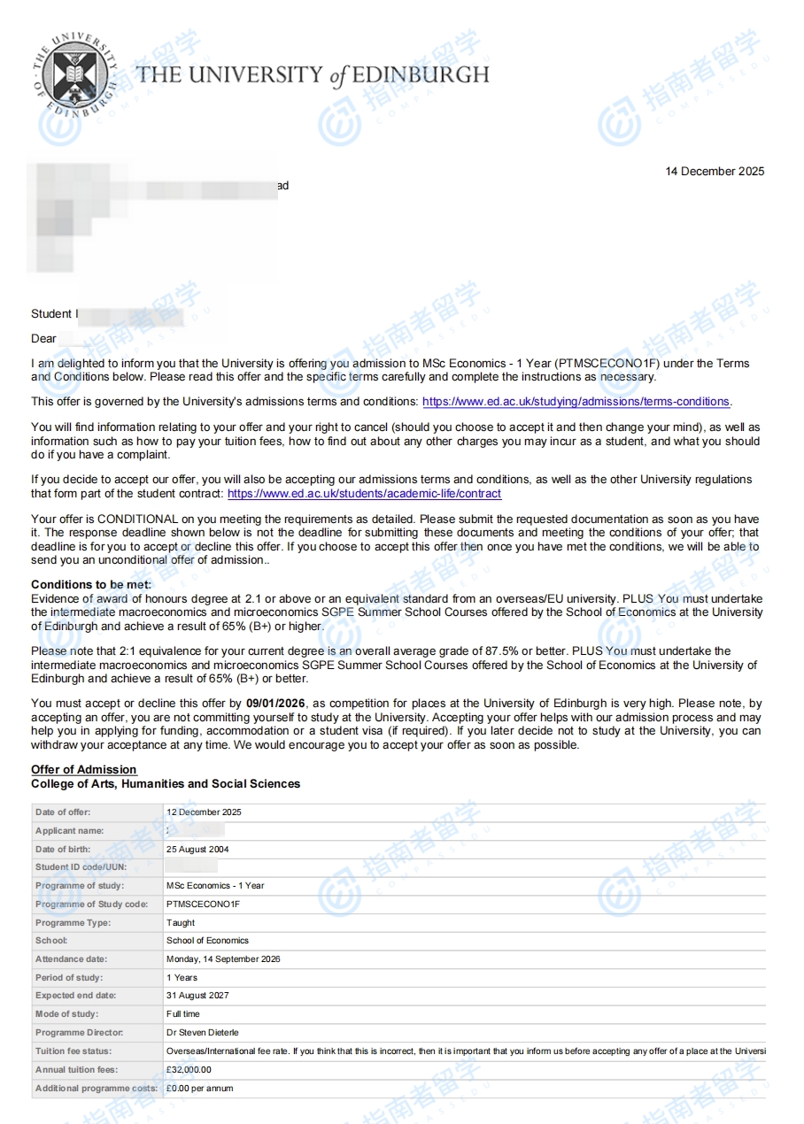 爱丁堡大学经济学理学硕士研究生offer一枚