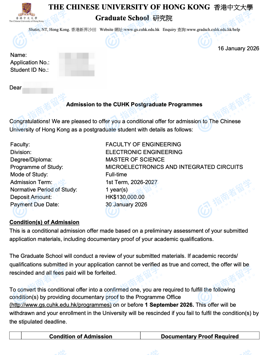 香港中文大学微电子与集成电路理学硕士研究生offer一枚