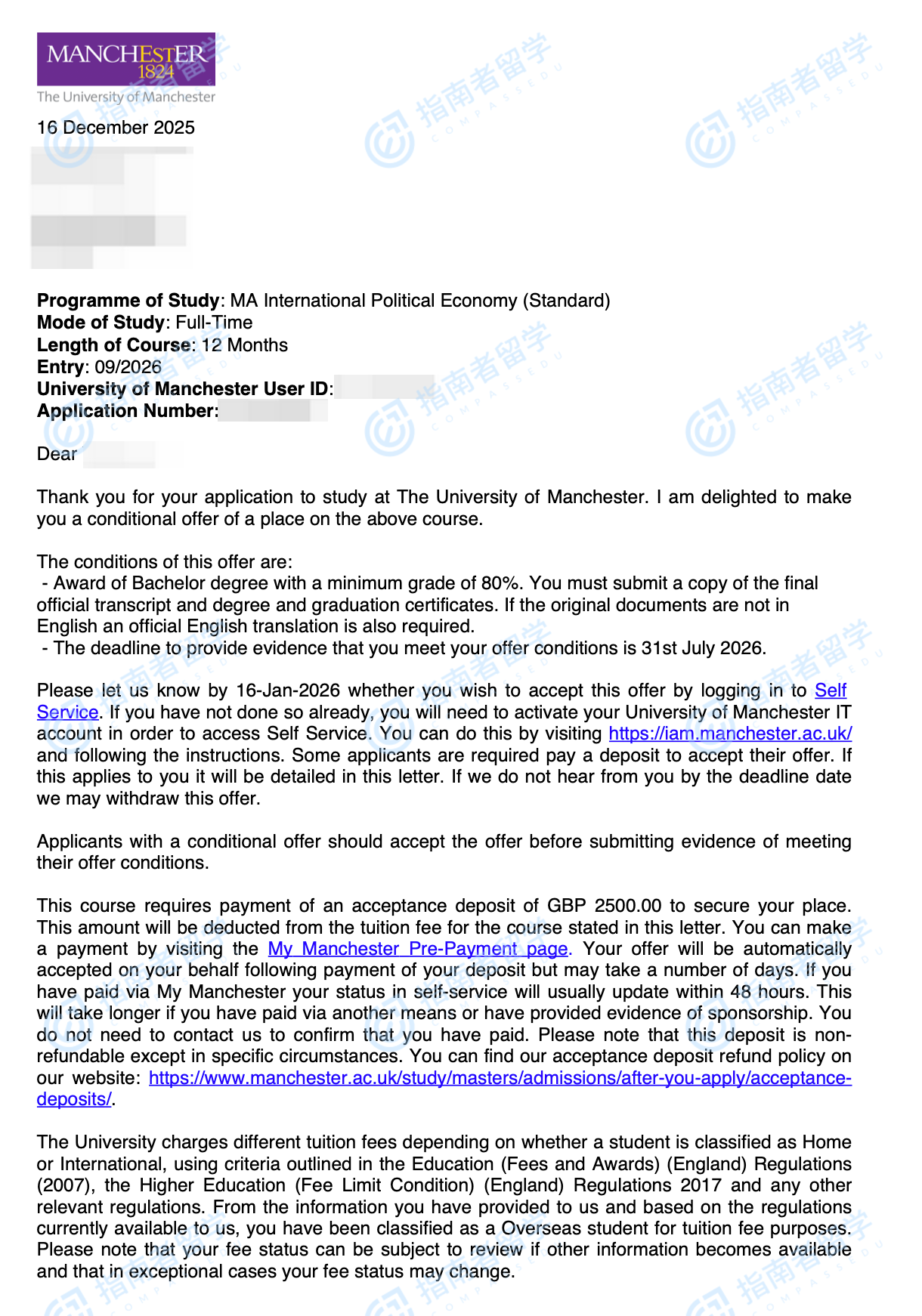 曼彻斯特大学国际政治经济学文学硕士(标准)研究生offer一枚