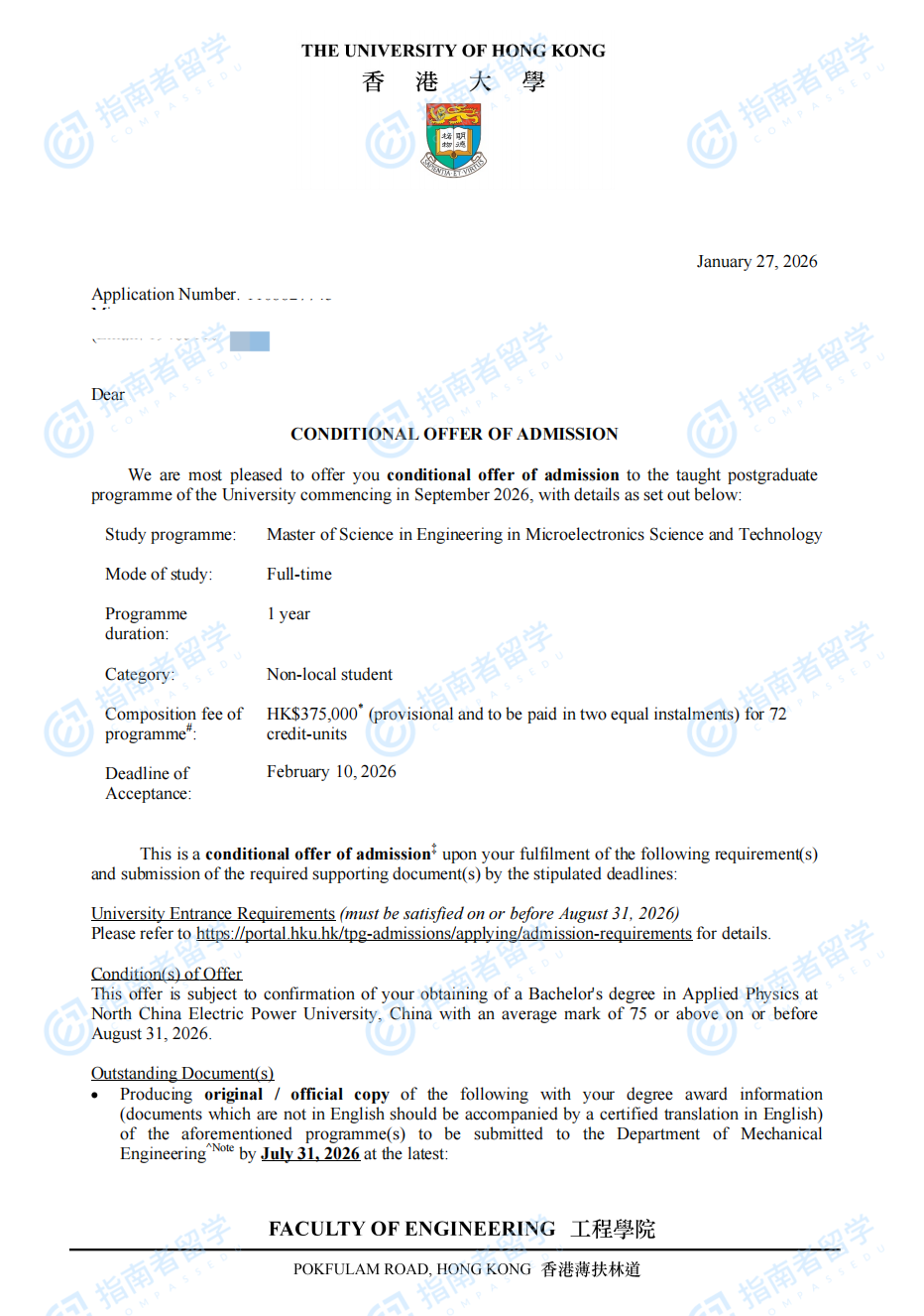 香港大学微电子科学与技术(工程)理学硕士研究生offer一枚