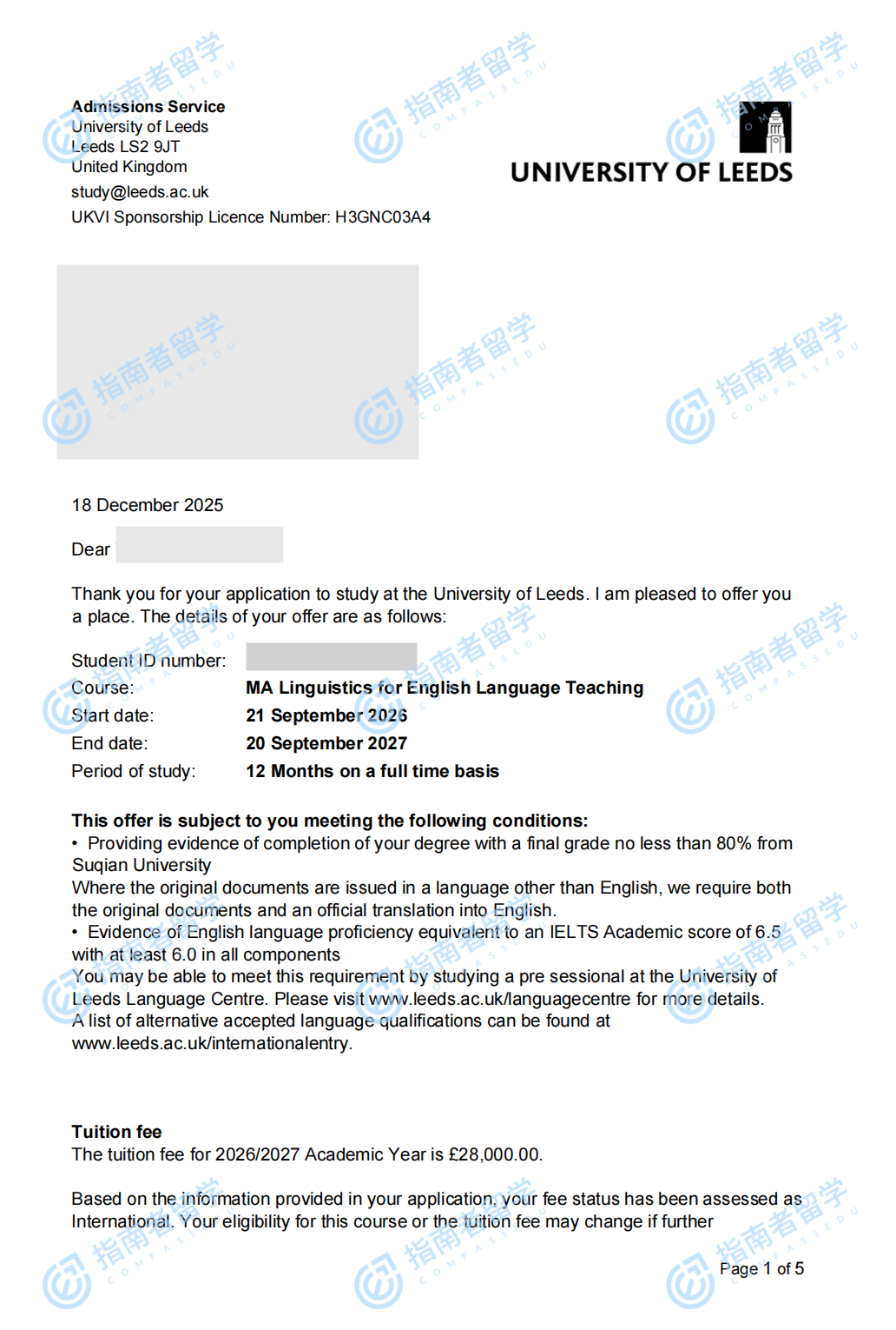 利兹大学英语语言教学语言学文学硕士研究生offer一枚