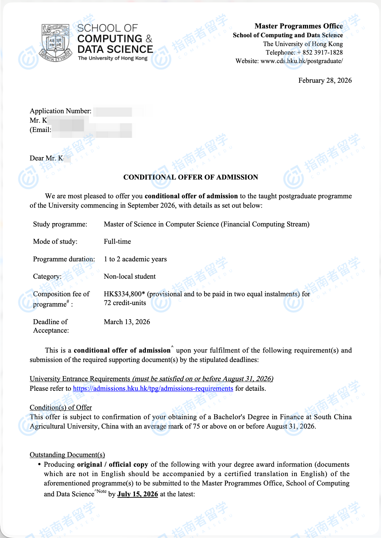 香港大学计算机科学理学硕士(金融计算方向)研究生offer一枚