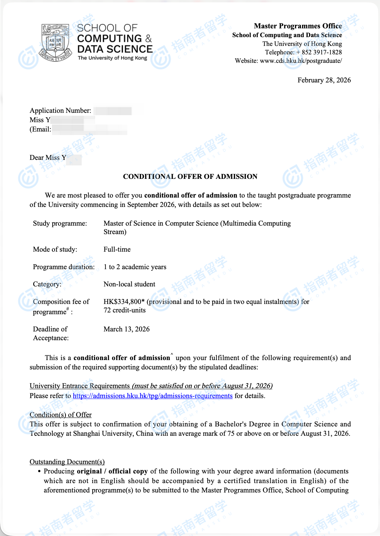 香港大学计算机科学理学硕士(多媒体计算方向)研究生offer一枚
