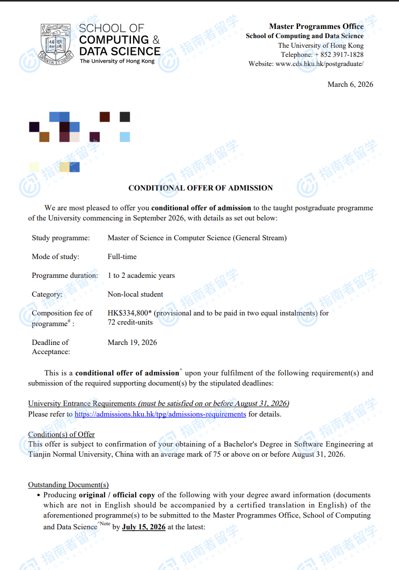 香港大学计算机科学理学硕士(常规方向)研究生offer一枚