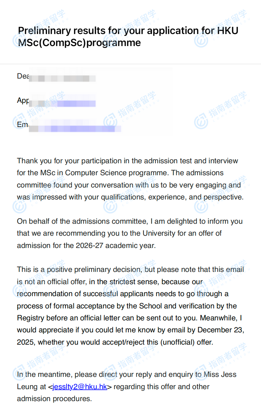 香港大学计算机科学理学硕士(常规方向)研究生offer一枚