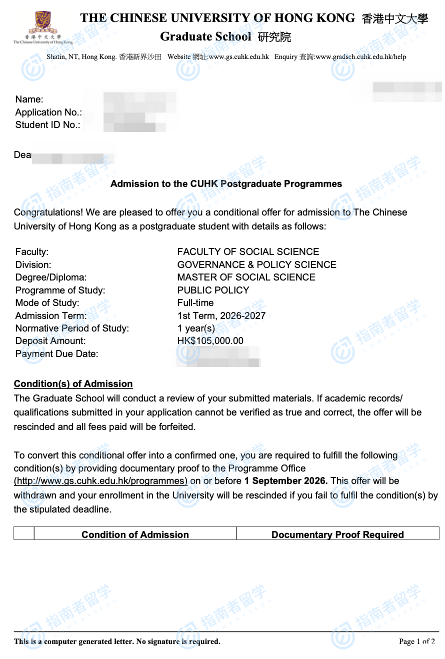 香港中文大学公共政策社会科学硕士研究生offer一枚