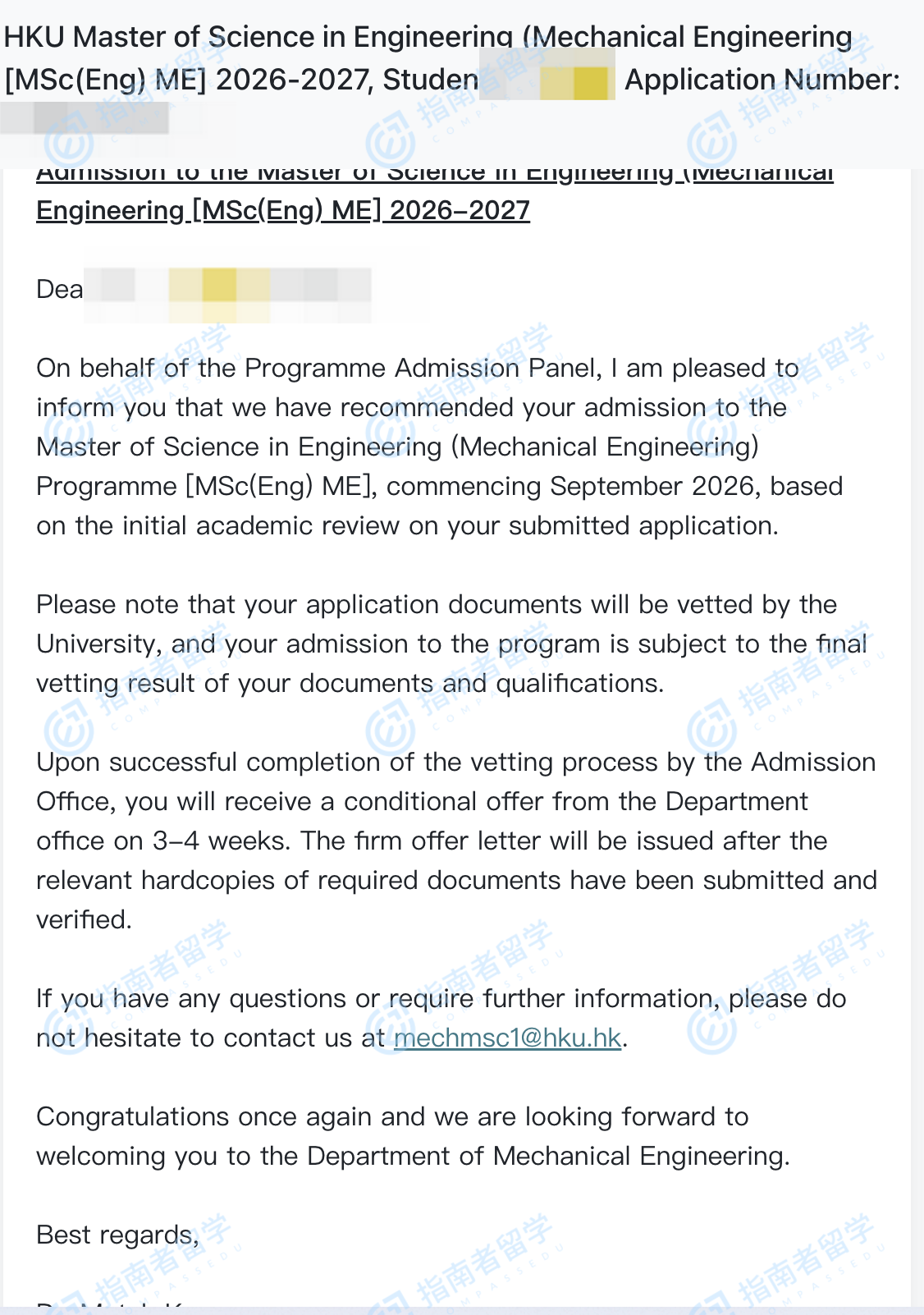 香港大学机械工程(工程)理学硕士研究生offer一枚