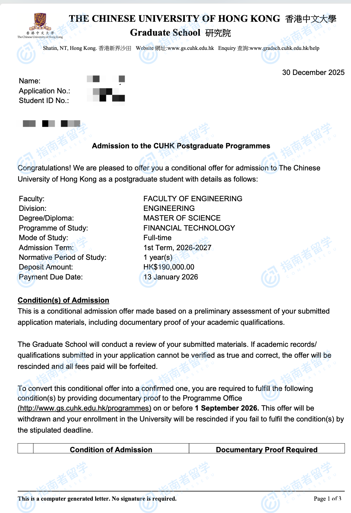 香港中文大学金融科技理学硕士研究生offer一枚
