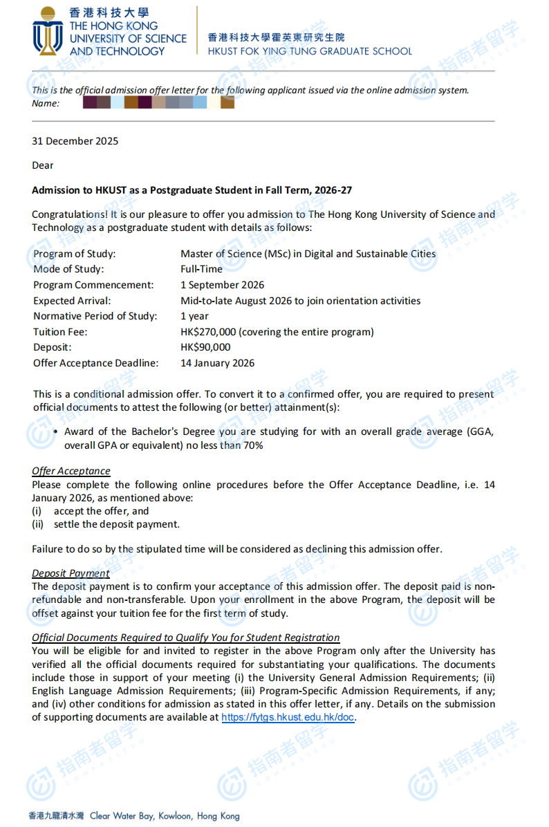 香港科技大学数字与可持续城市理学硕士研究生offer一枚