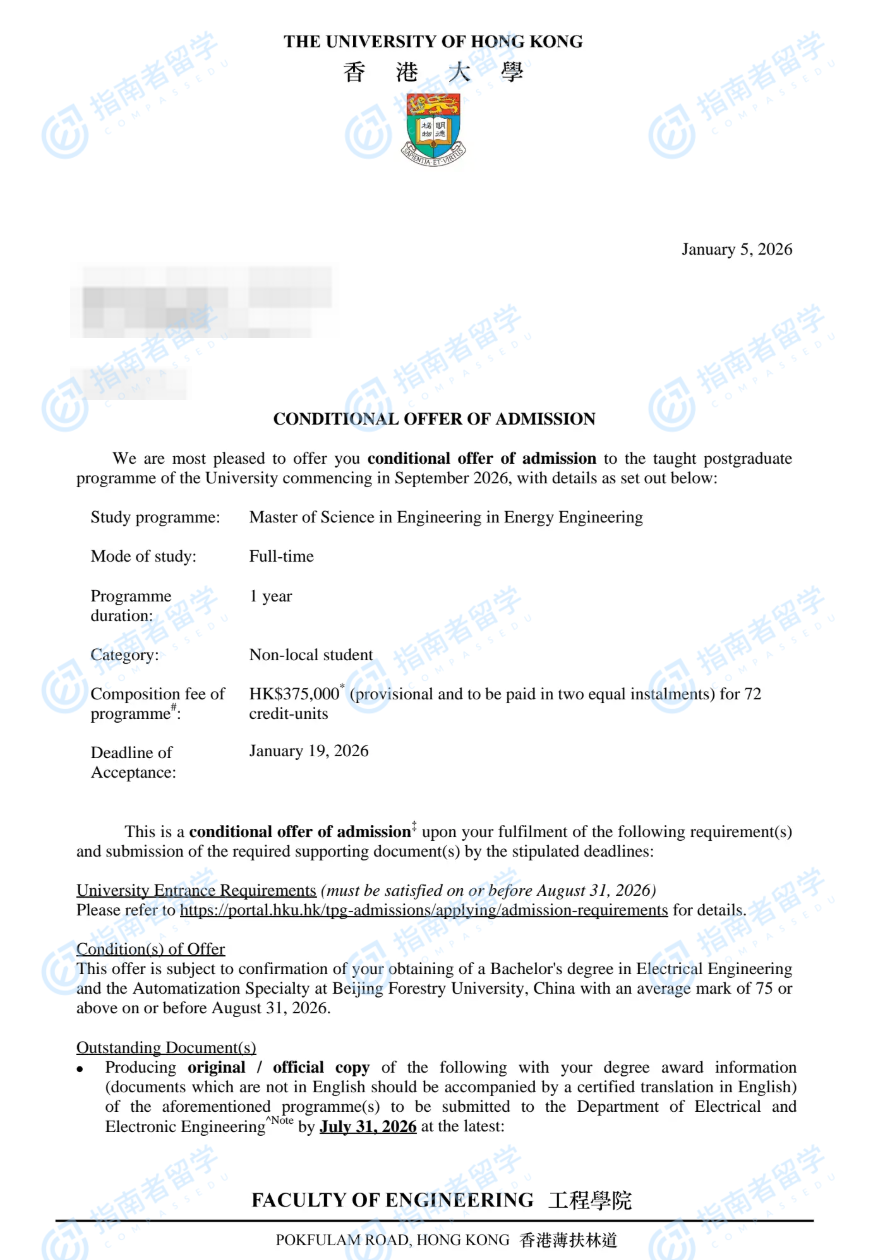 香港大学能源工程(工程)理学硕士研究生offer一枚