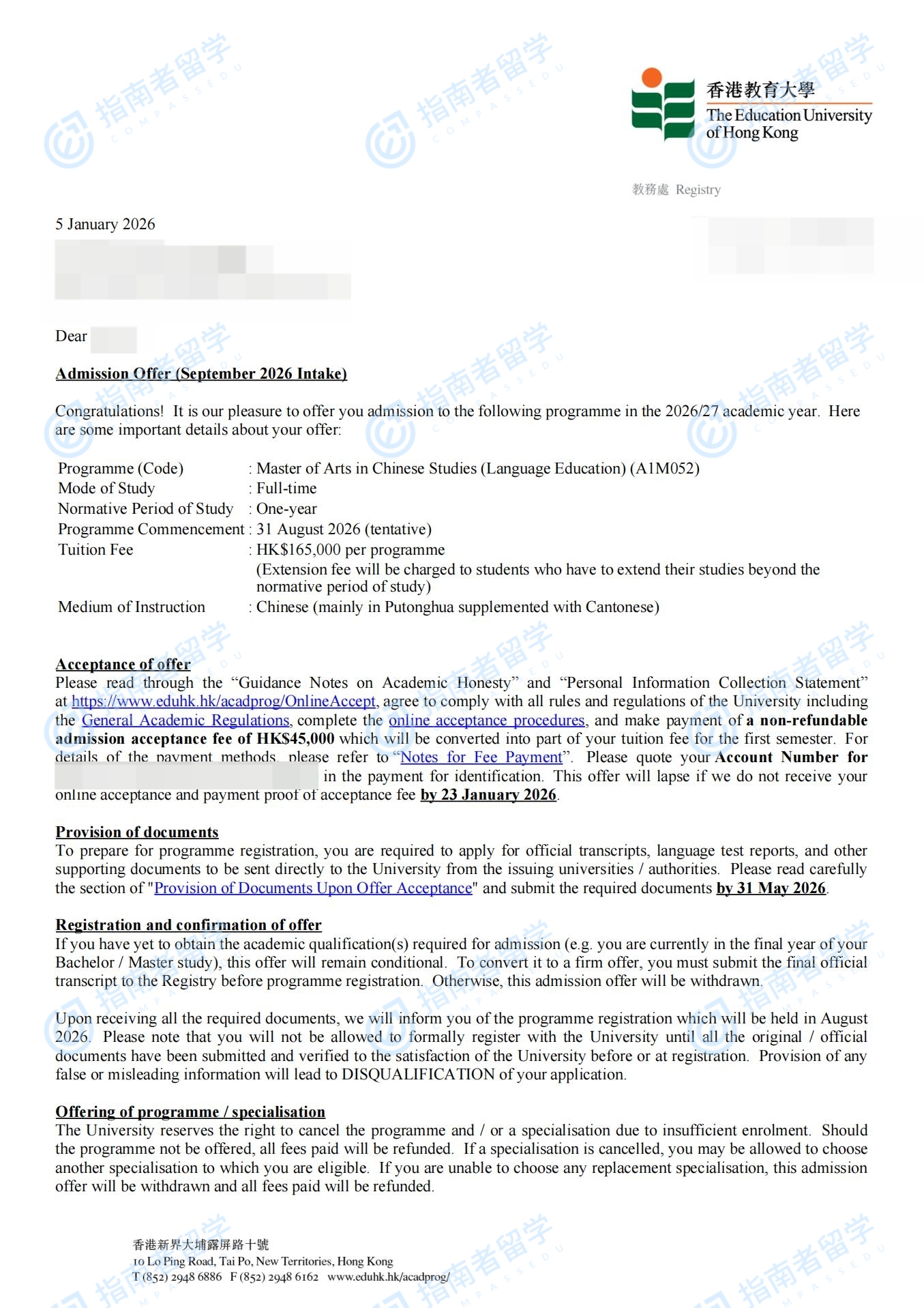香港教育大学中文研究文学硕士(语文教育)研究生offer一枚