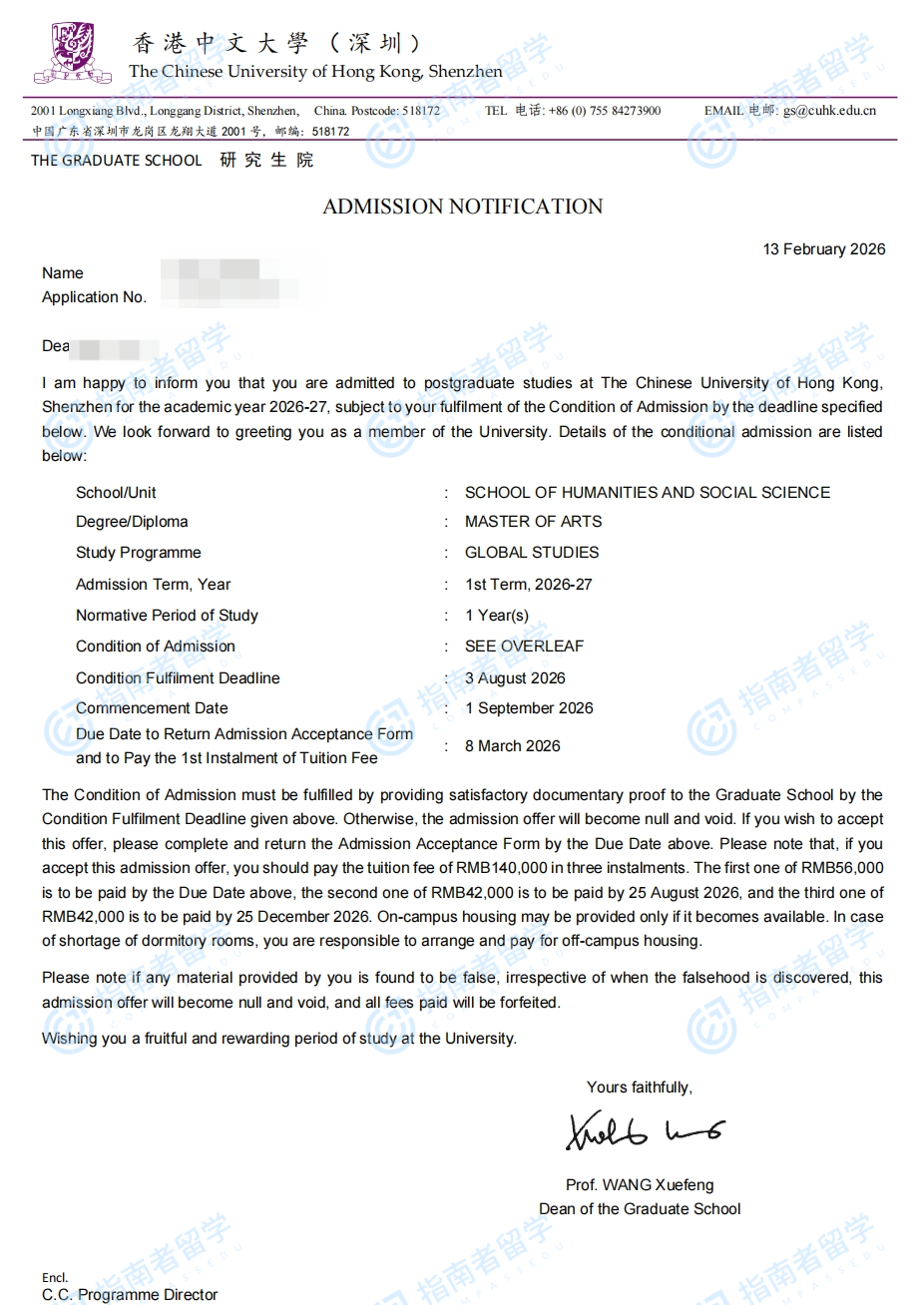 香港中文大学全球研究文学硕士(CUHK-Shenzhen)研究生offer一枚