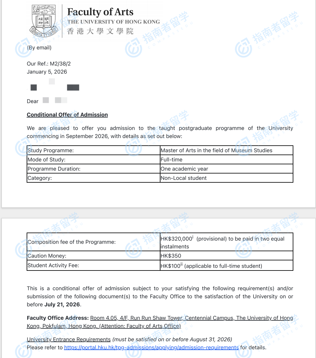 香港大学博物馆研究文学硕士研究生offer一枚
