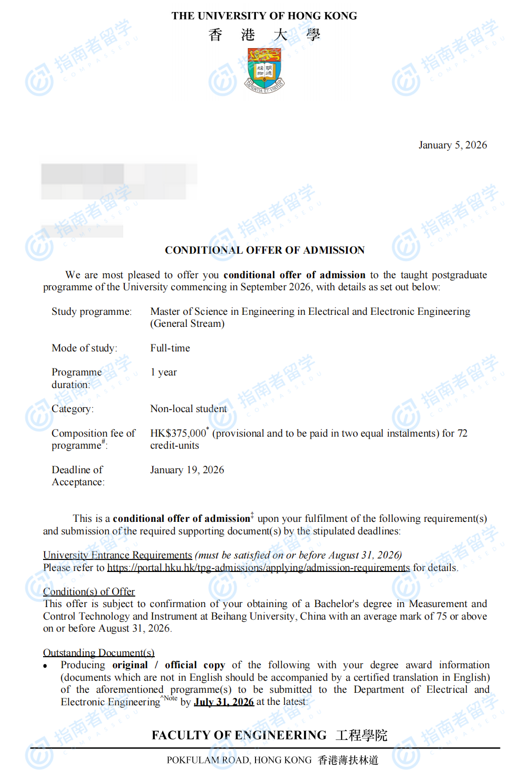 香港大学电气与电子工程(工程)理学硕士 - 常规方向研究生offer一枚