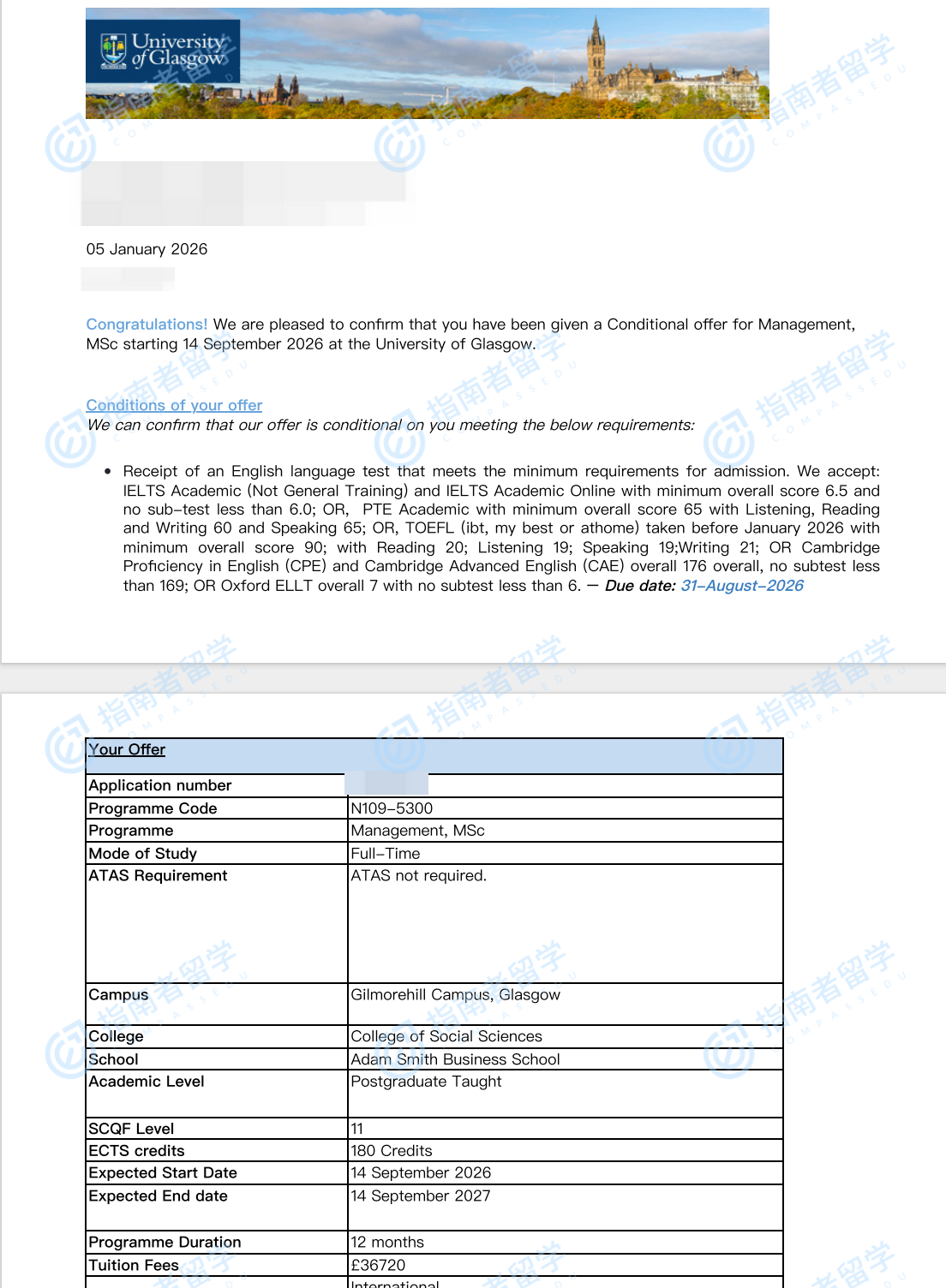 格拉斯哥大学管理学理学硕士研究生offer一枚