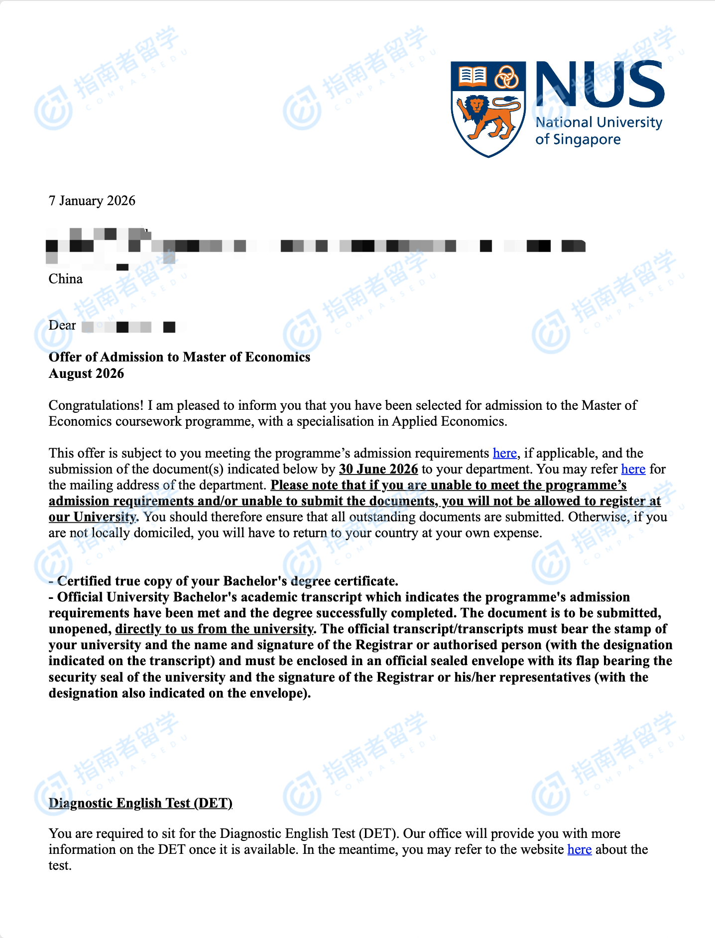 新加坡国立大学经济学硕士研究生offer一枚