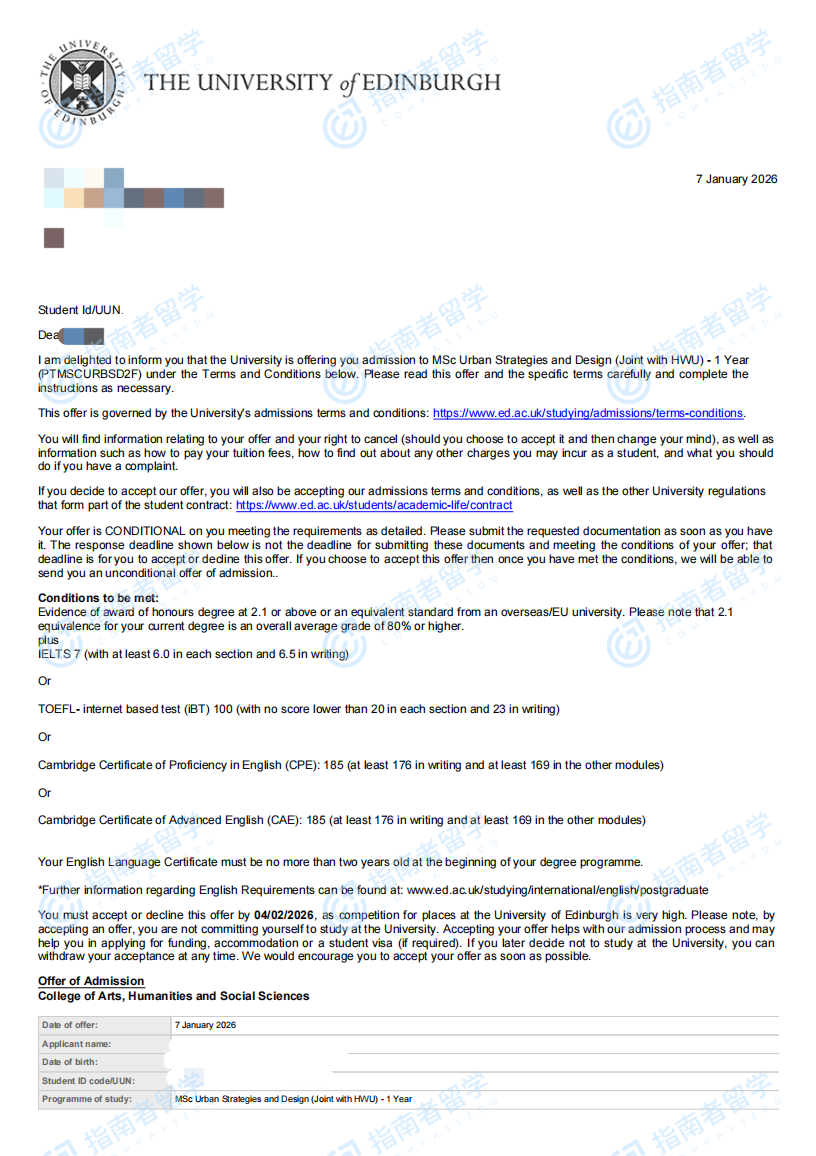 爱丁堡大学城市战略与设计理学硕士(爱丁堡大学-赫瑞瓦特大学联合开设)研究生offer一枚