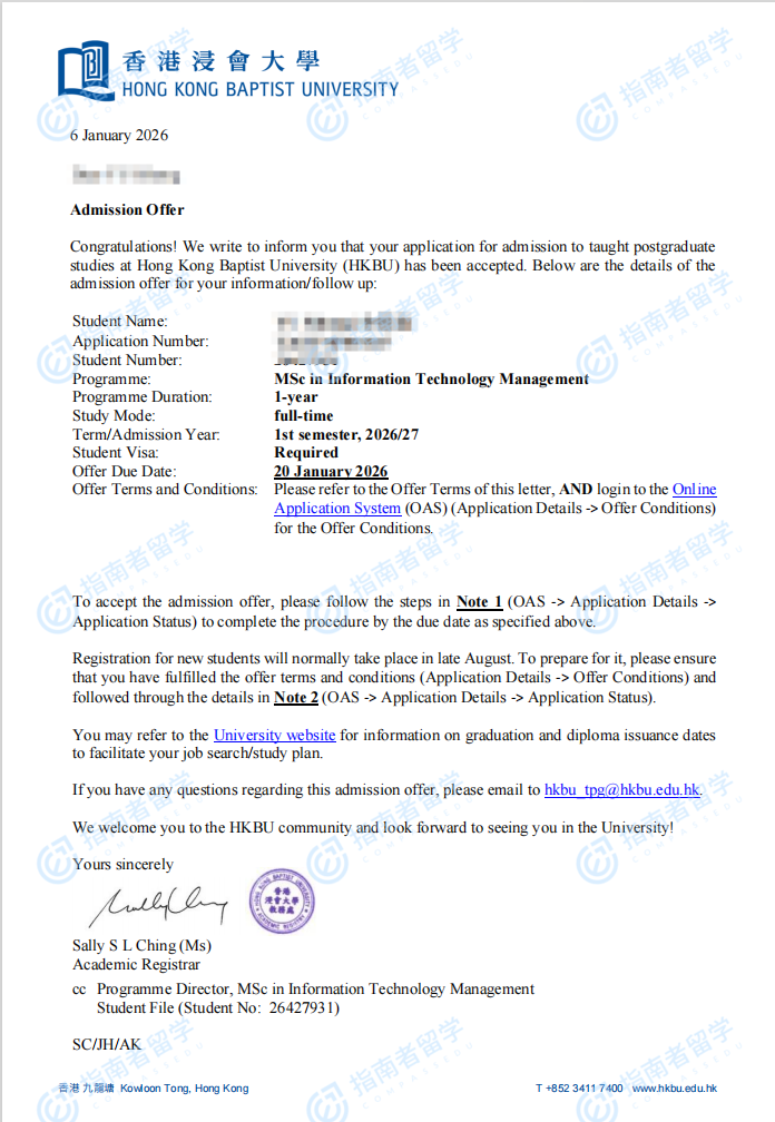 香港浸会大学资讯科技管理理学硕士研究生offer一枚