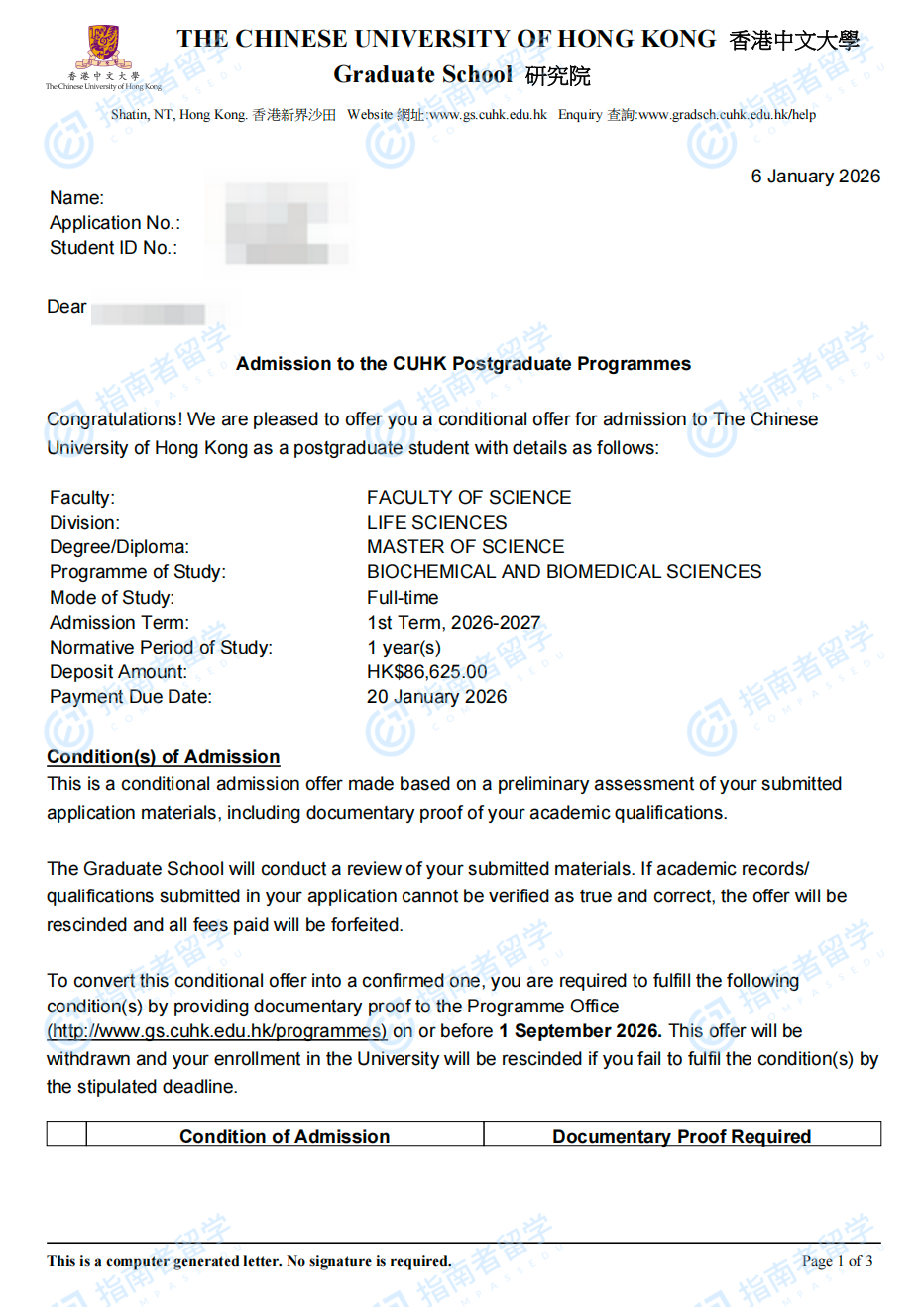 香港中文大学生物化学与生物医学科学理学硕士研究生offer一枚