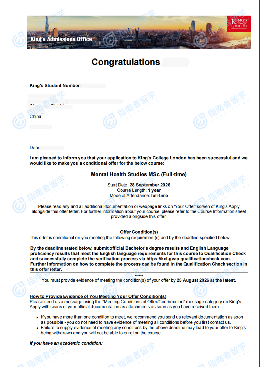 伦敦大学国王学院心理健康研究理学硕士研究生offer一枚