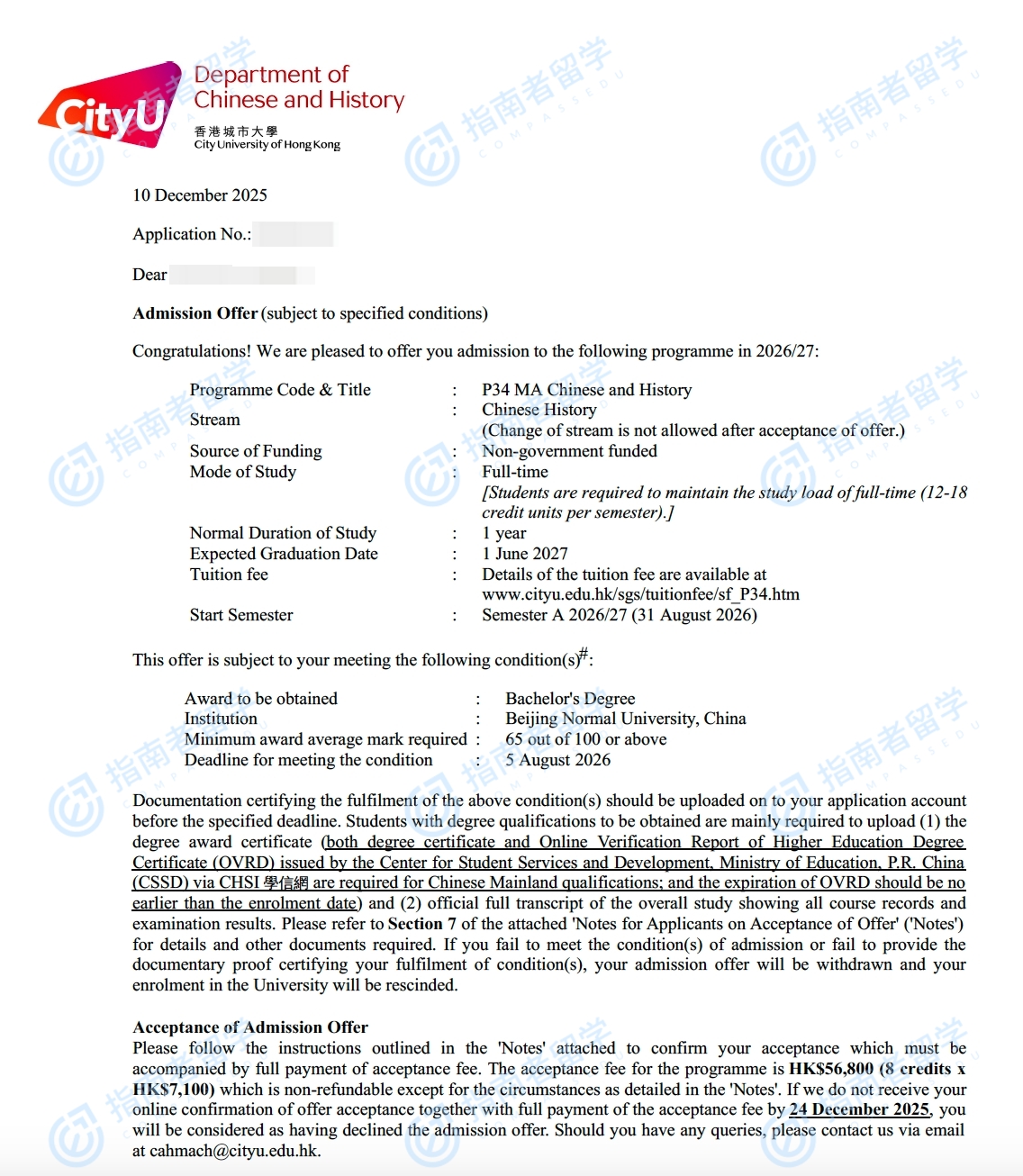 香港城市大学中国语言文学与历史文学硕士研究生offer一枚
