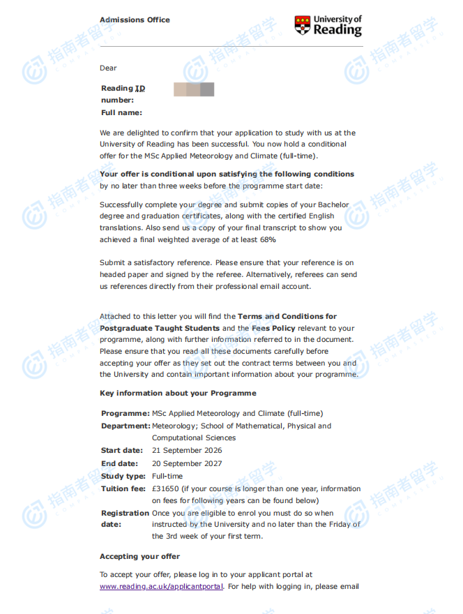 雷丁大学应用气象学与气候理学硕士研究生offer一枚