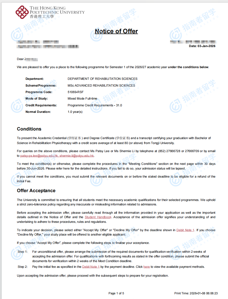 香港理工大学深造康复科学理学硕士研究生offer一枚