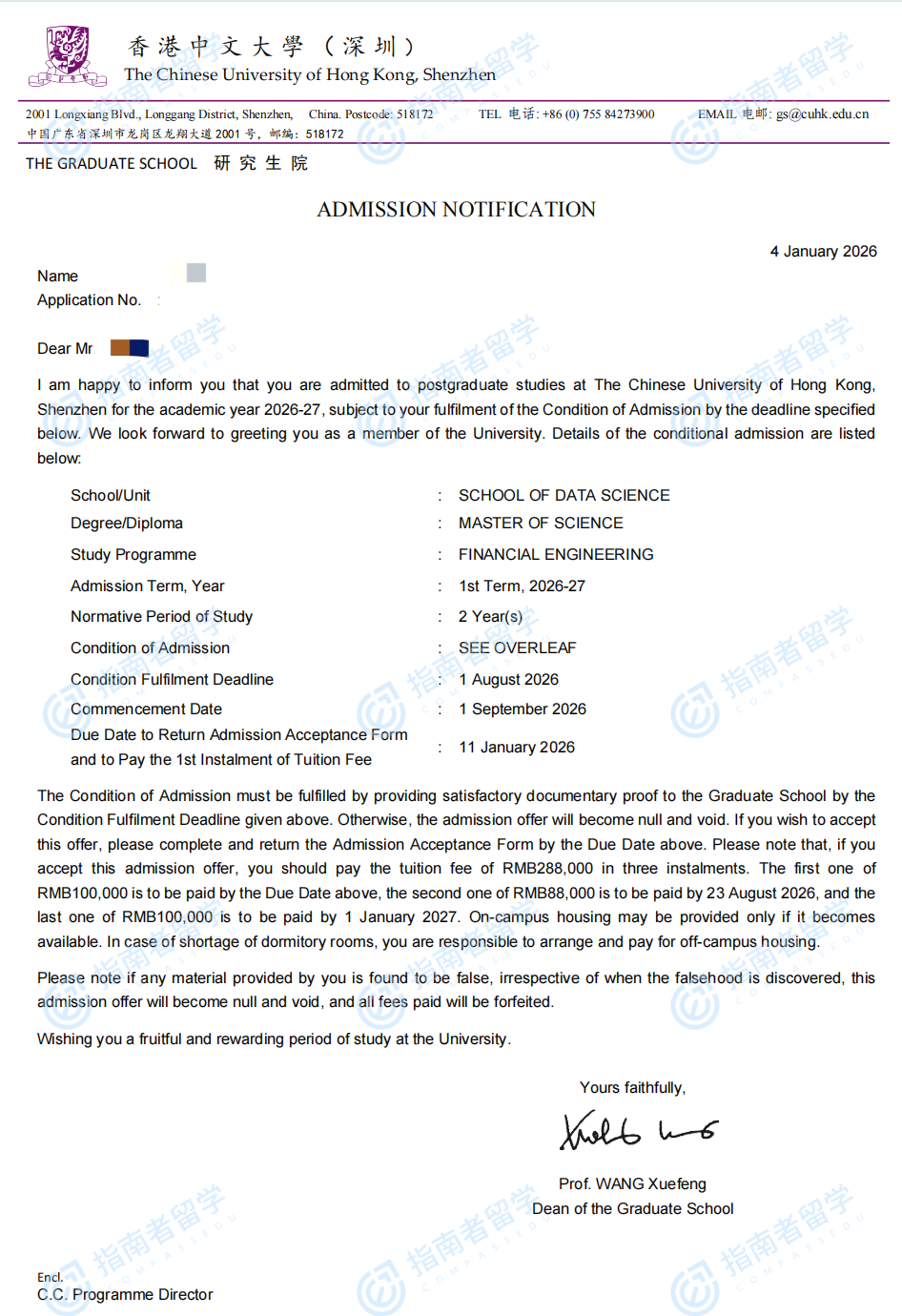 香港中文大学金融工程理学硕士(CUHK-Shenzhen)研究生offer一枚